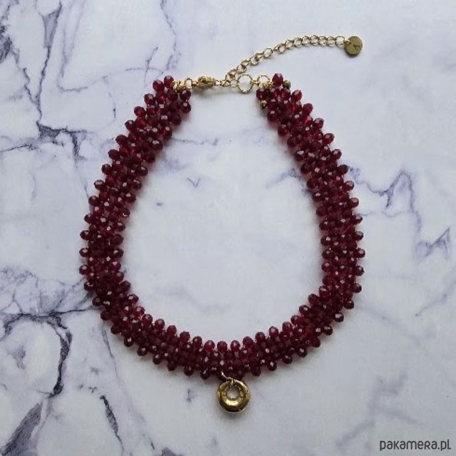 Choker 5-rzędowy w kolorze burgundowym z ozdobną zawieszką w kształcie wypukłego kółeczka. Zawieszka dopinana jest do chokera za pomocą federinga, dlatego można go nosić w 2 wersjach – z zawieszką lub bez. Całość wykonana jest ze szkła kryształowego w połączeniu z elementami ze stali szlachetnej pozłacanej. Naszyjnik pleciony ręcznie z kryształków nawinięty jest na elastyczną, trwałą gumkę silikonową, dzięki czemu dopasowuje się do szyi i pięknie przylega. Prezentuje się niepowtarzalnie, okazale i pięknie błyszczy pod wpływem światła.