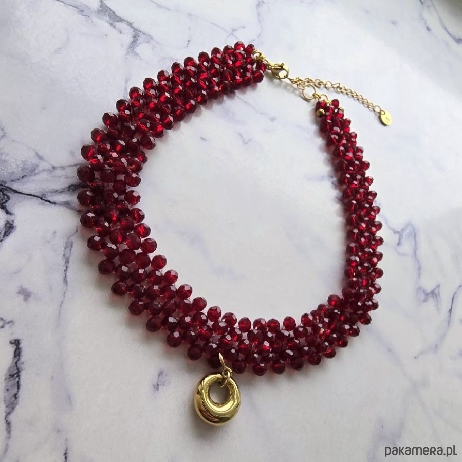 Choker 5-rzędowy w kolorze burgundowym z ozdobną zawieszką w kształcie wypukłego kółeczka. Zawieszka dopinana jest do chokera za pomocą federinga, dlatego można go nosić w 2 wersjach – z zawieszką lub bez. Całość wykonana jest ze szkła kryształowego w połączeniu z elementami ze stali szlachetnej pozłacanej. Naszyjnik pleciony ręcznie z kryształków nawinięty jest na elastyczną, trwałą gumkę silikonową, dzięki czemu dopasowuje się do szyi i pięknie przylega. Prezentuje się niepowtarzalnie, okazale i pięknie błyszczy pod wpływem światła.