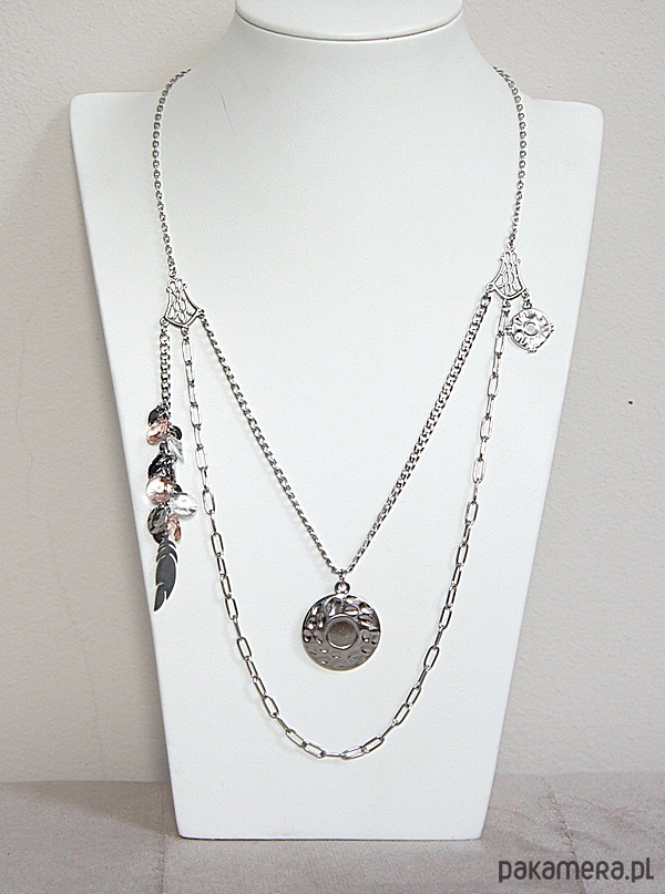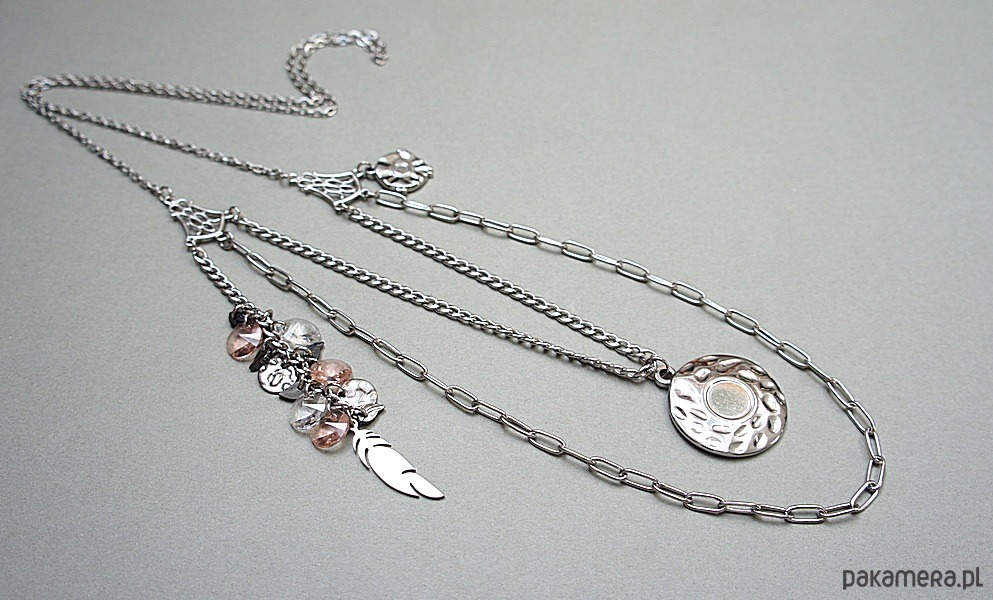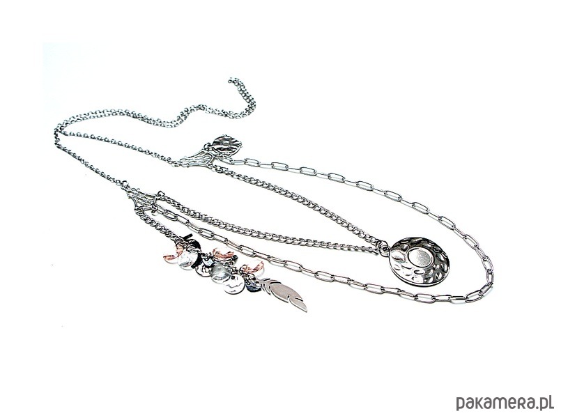 Długi naszyjnik wykonany w całości ze stali szlachetnej w połączeniu z hematytami.w kształcie grafitowych listków ,kryształkami [8mm] .Całkowita długość naszyjnika po dłuższym obwodzie 75cm.Naszyjnik zakładany przez głowę Biżuteria ozdobnie zapakowana.