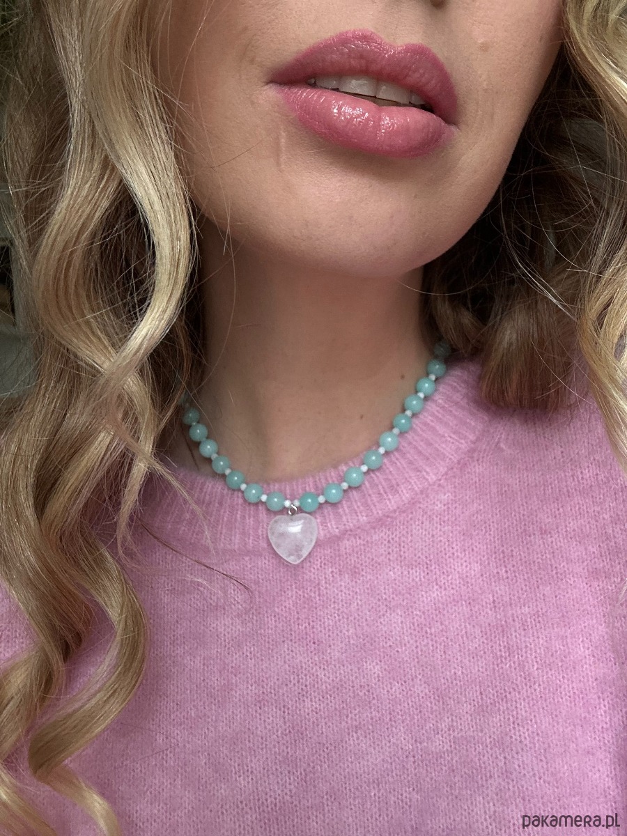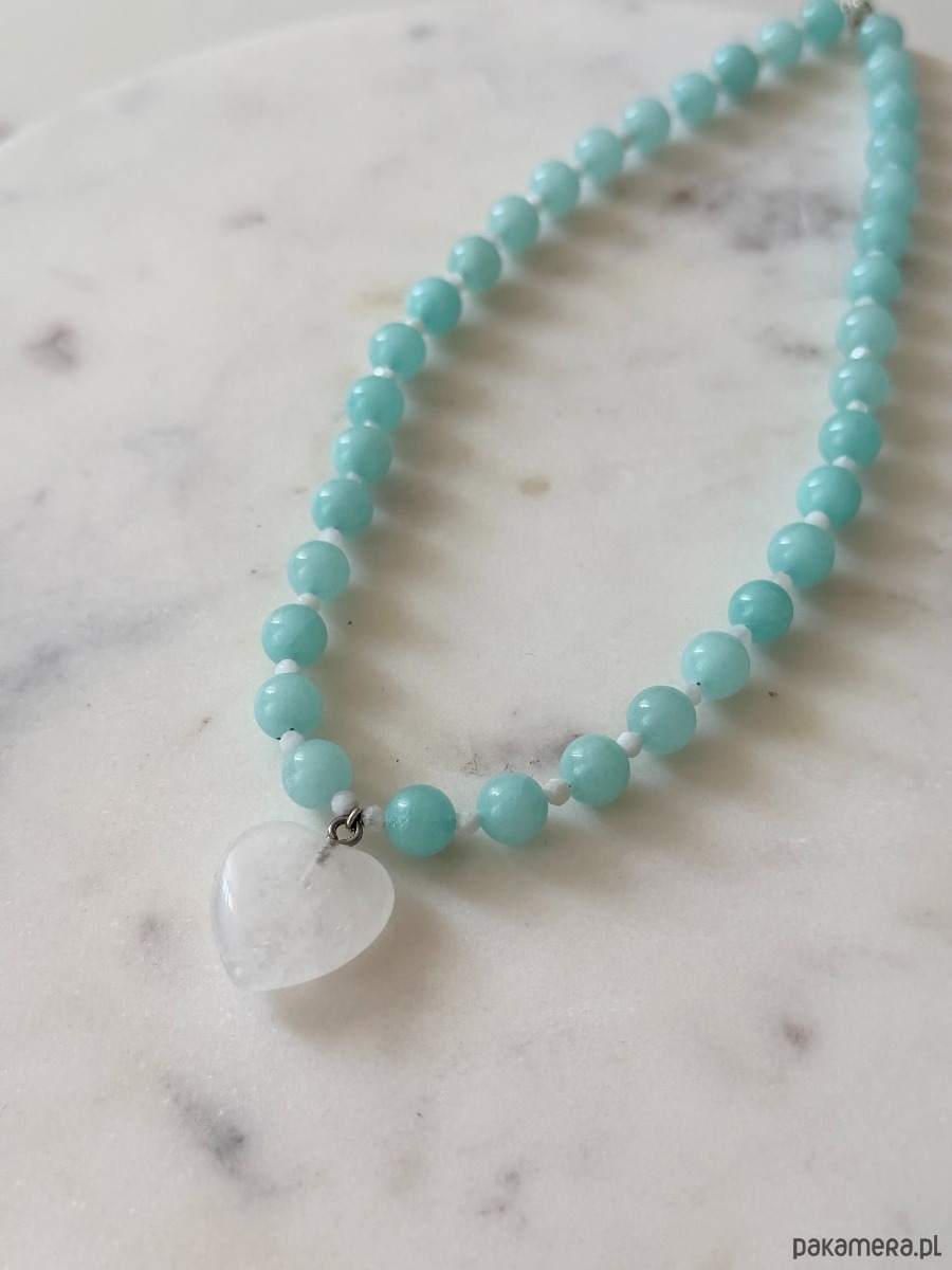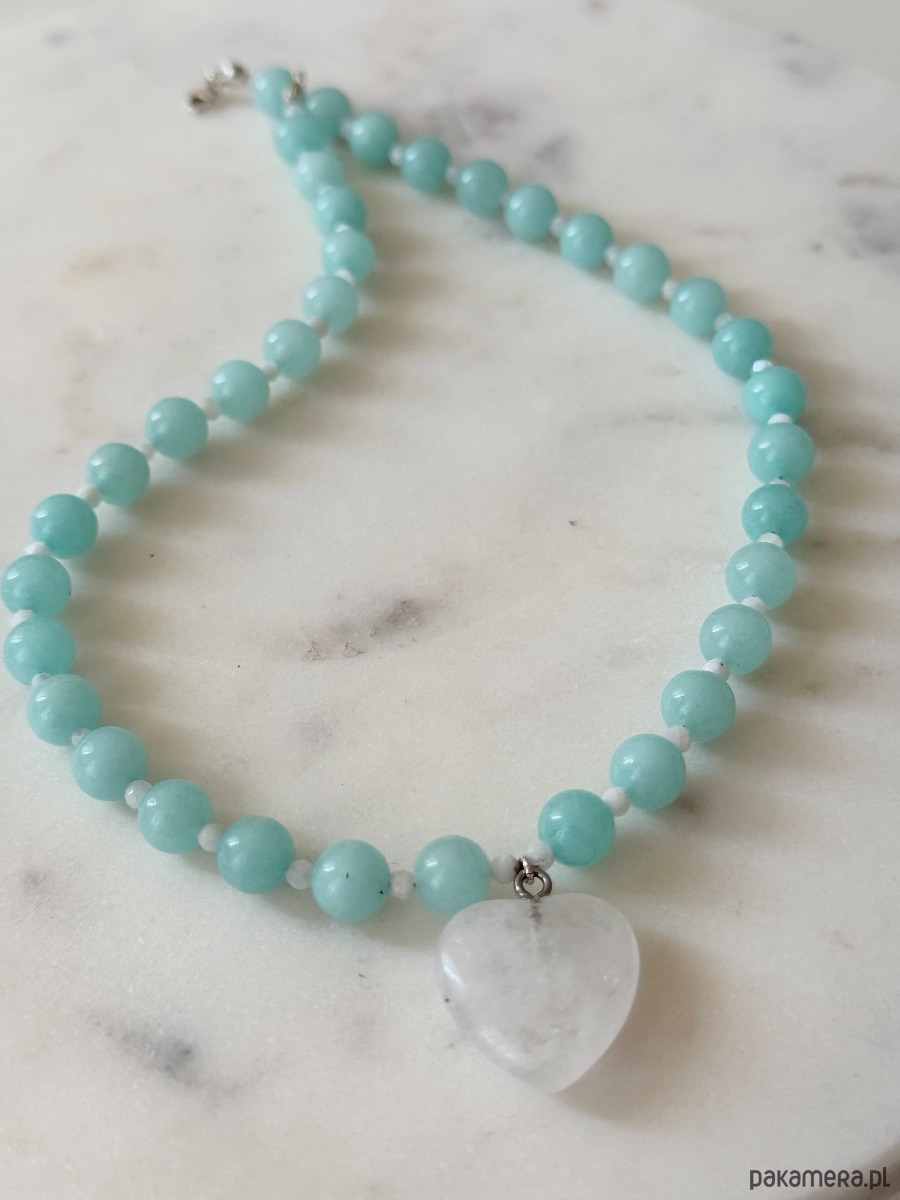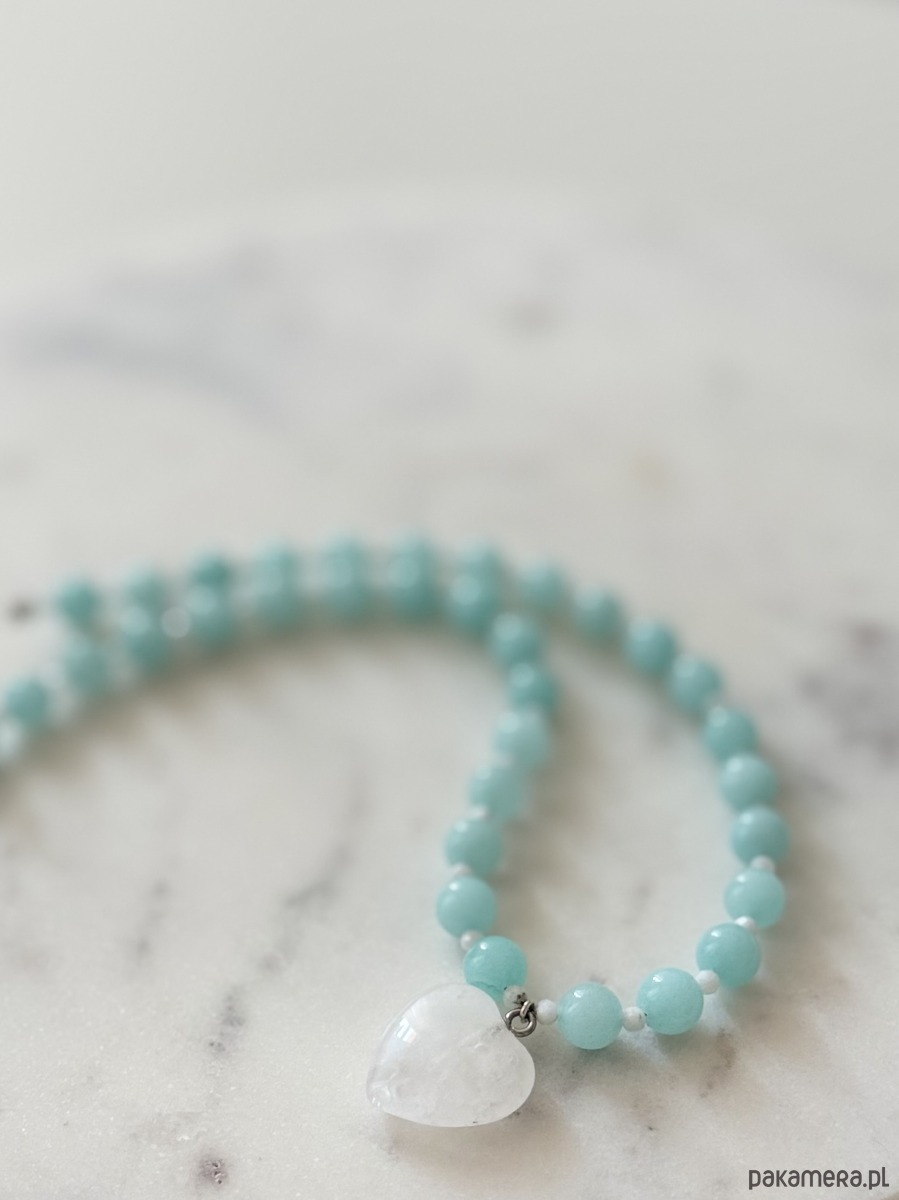 Jest zrobiony z jadeitu, kamienia księżycowego i serca z kryształu górskiego o wielkości 20 mm, nawleczonych na żyłkę jubilerską.