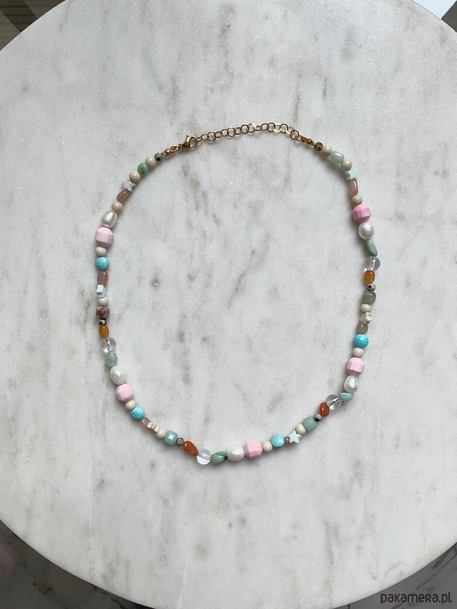 Naszyjnik jest zrobiony z bursztynowych opali, różowej muszli, amazonitu w kolorze morza, kamieni słonecznych połyskujących jak piasek, przejrzystych kryształów górskich oraz pereł naturalnych. Całość dopełniają jaspisy dalmatyńskie i kamienie rzeczne.