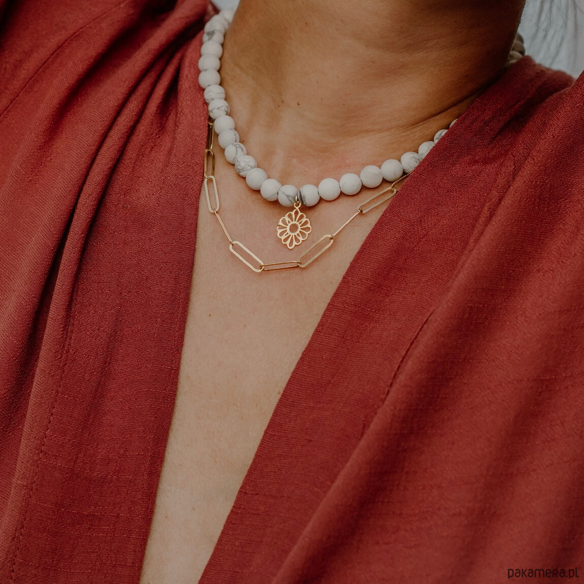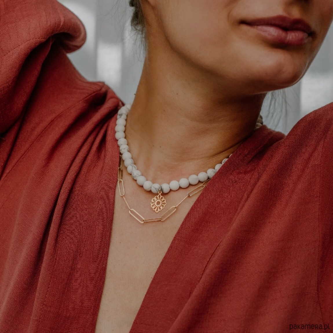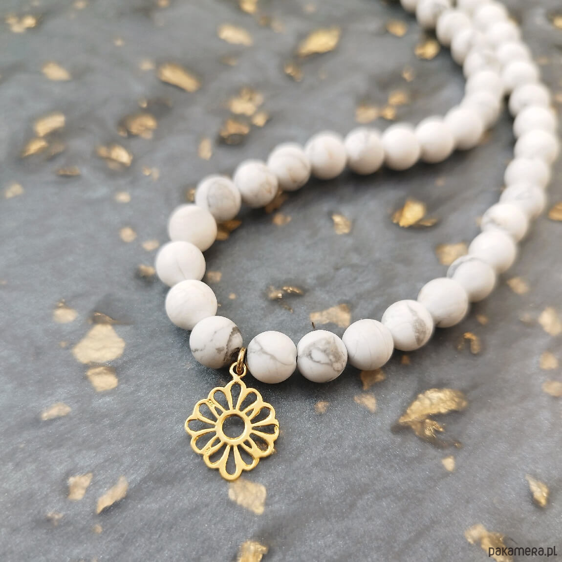 Choker HOWLITE został wykonany z kamieni howlitu i zawieszki ażurowej w kształcie kwiatka, wykonanej ze srebra pozłacanego 24 karatowym, żółtym złotem,