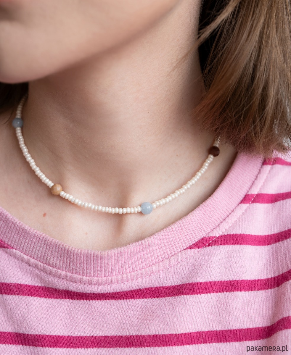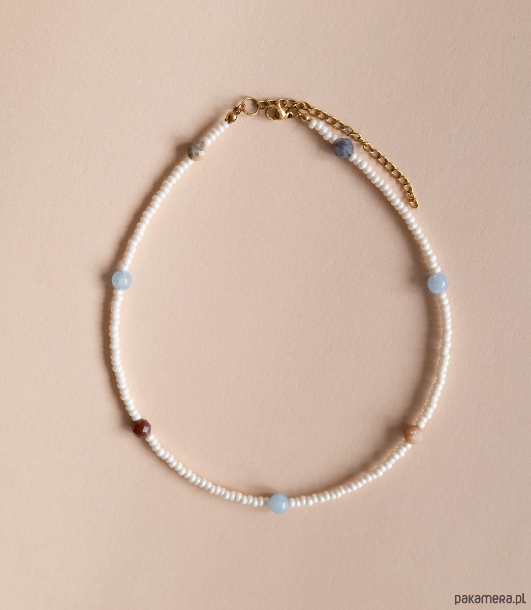 Ręcznie wykonany choker z czeskich koralików Preciosa z dodatkiem kamieni naturalnych, które dodają mu charakteru i subtelnej energii. Każdy element jest starannie ułożony, tworząc harmonijną i lekką kompozycję, idealną do codziennych stylizacji lub jako delikatny akcent w połączeniu z inną biżuterią.