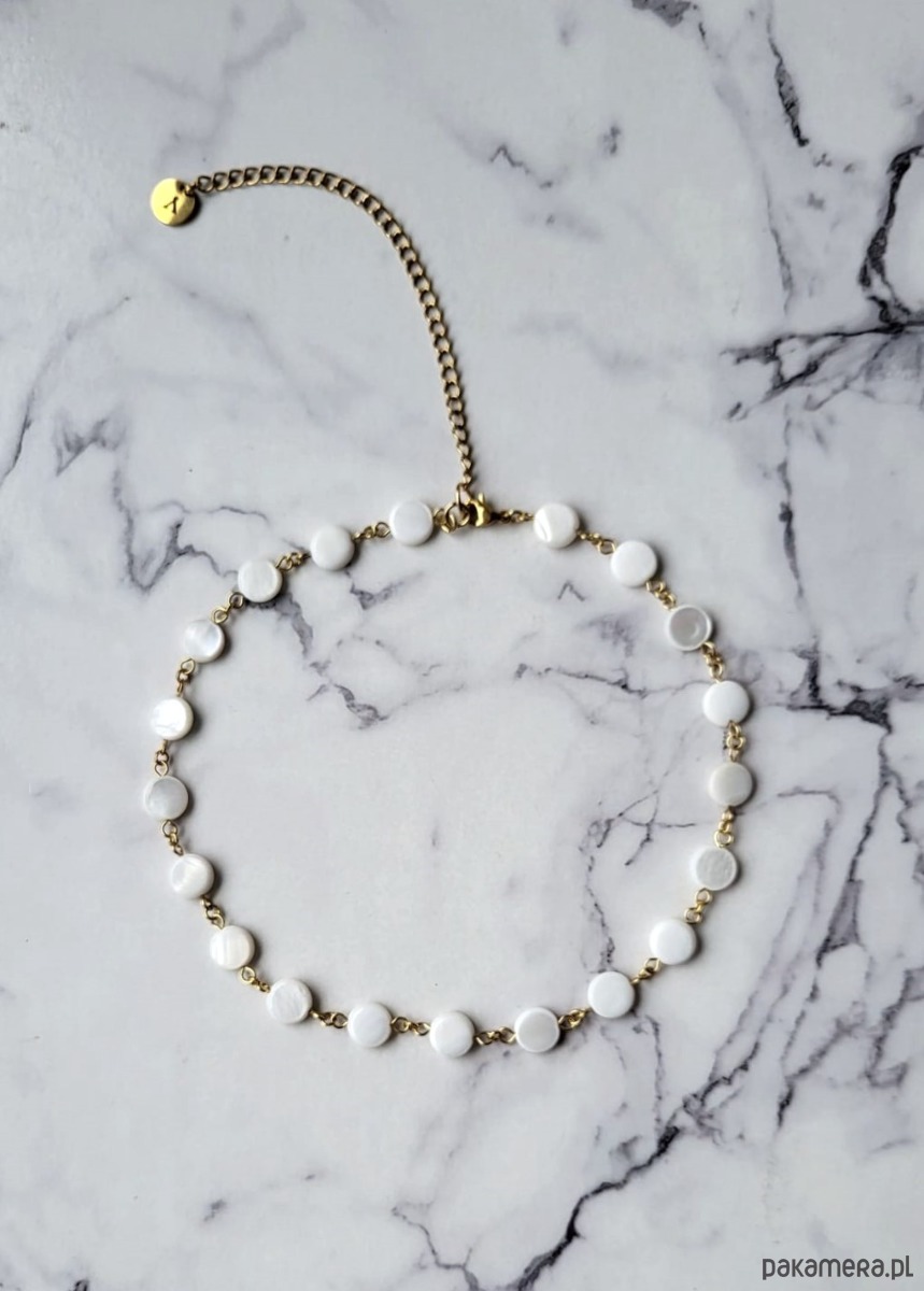 Choker z pastylek masy perłowej w odcieniu bieli, wykonany ze stali szlachetnej oraz z kółeczek łączących z mosiądzu pozłacanego 14-karatowym złotem, odpornych na ścieranie. Zapinany jest na karabińczyk, z możliwością regulacji dzięki dodatkowej przedłużce (+ 5 cm), z logo Afroditte na jej końcu. Piękny odcień białej masy perłowej sprawia, że choker prezentuje się elegancko i z klasą, a jednocześnie doskonale pasuje również do stylizacji boho.
