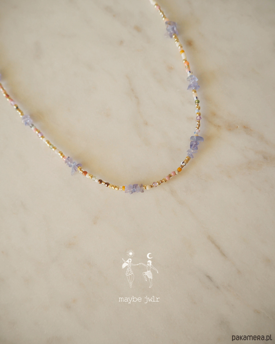 Naszyjnik subtelnie mieni się wieloma kolorami, a jego główne odcienie – złoto, zgaszony róż, beż, delikatny baby blue i kilka dyskretnych akcentów – dodają lekkości i kobiecej elegancji.