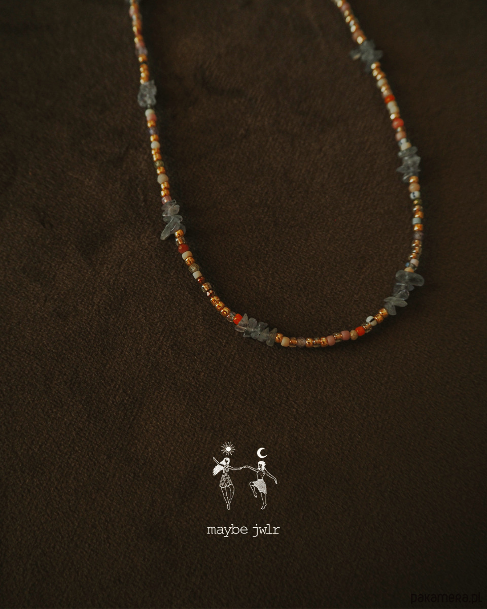 Krótkim naszyjnikiem z kolorowej mieszanki naturalnych kamieni i szklanych koralików