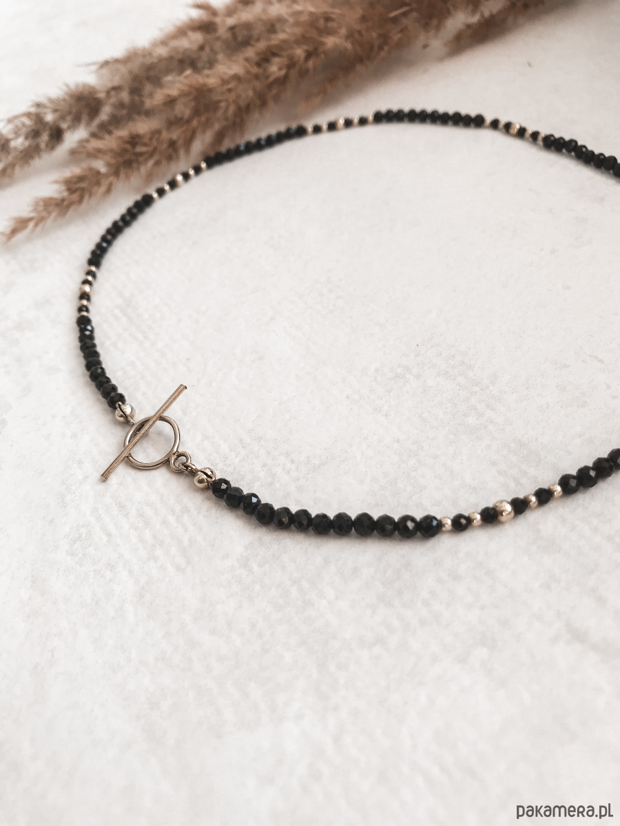 Choker wykonany z kamieni czarnego turmalinu oraz srebrnych koralików próby 925 pozłacanych 24K złotem. Eleganckie i ponadczasowe połączenie czerni i złota zachwyca swym blaskiem a zarazem prostotą.