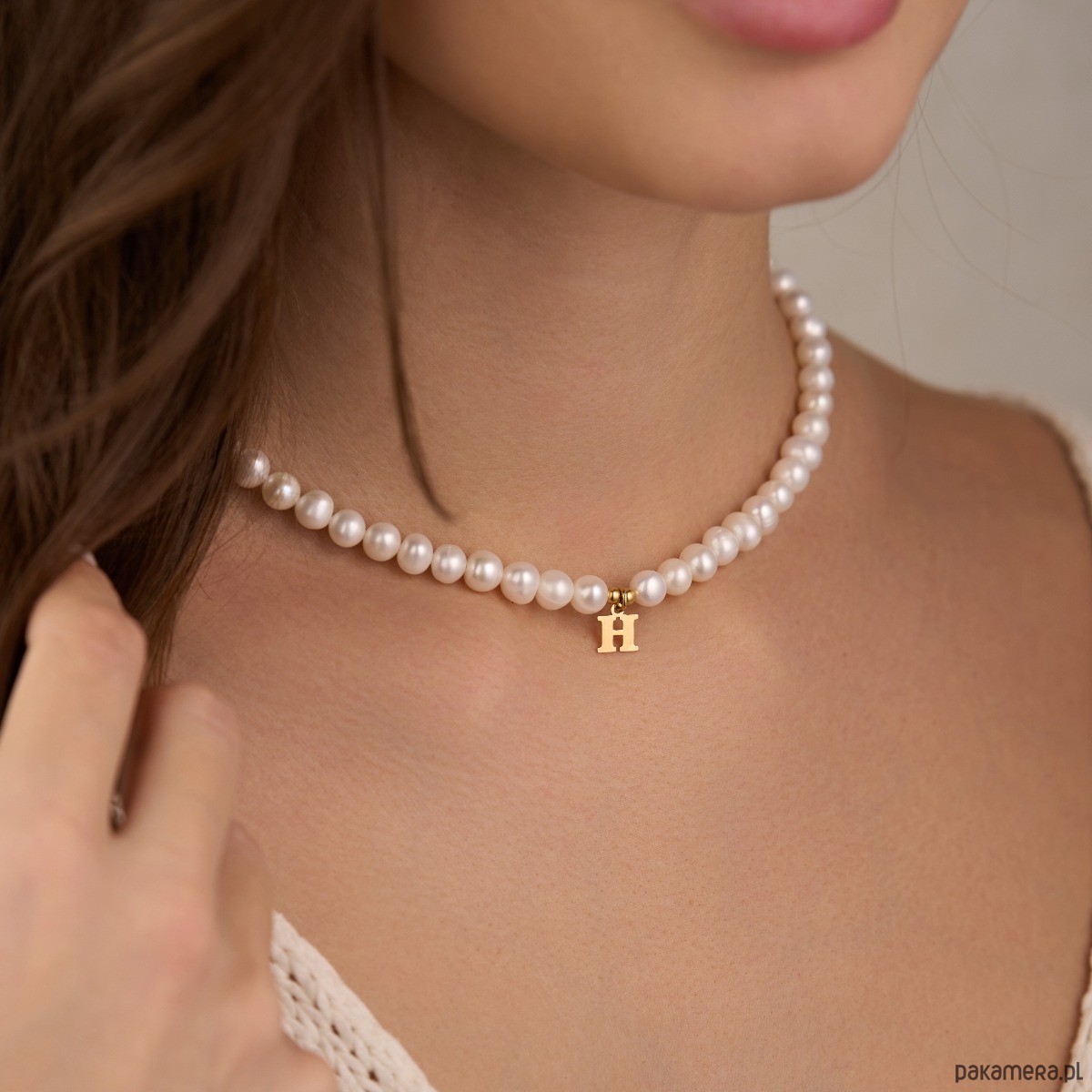 Choker naszyjnik perły naturalne literka- srebro 925 pozłacane