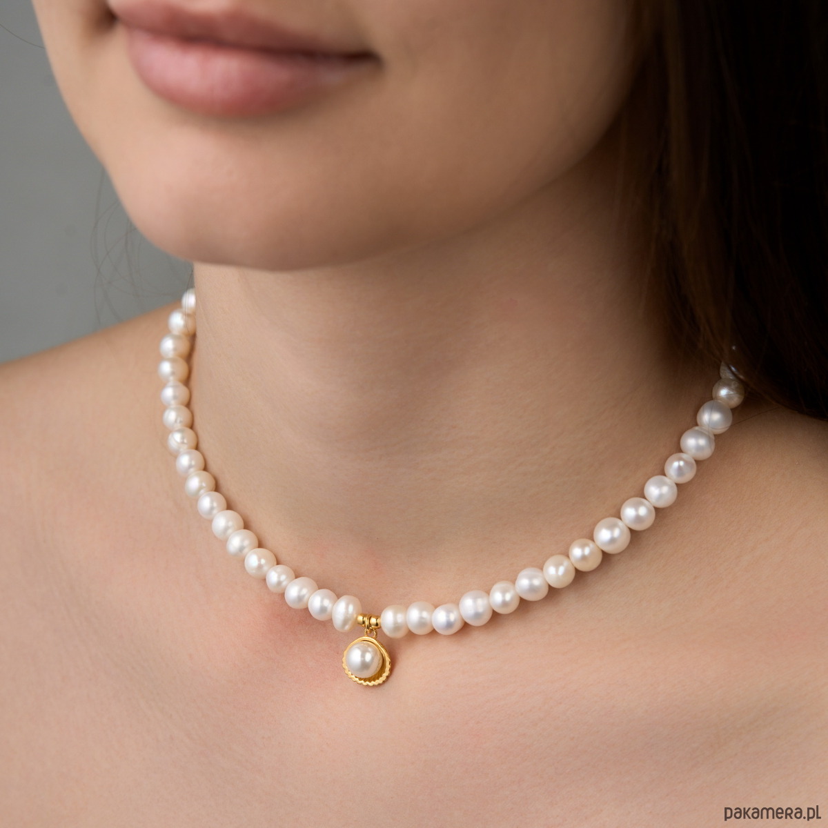 Choker naszyjnik z naturalnych pereł muszelka srebro 925 pozłacane