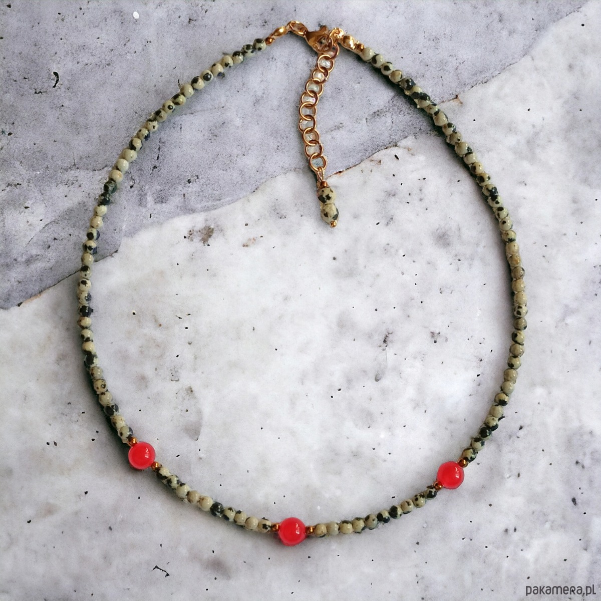 Naszyjnik na solidnej lince stalowej (miękkiej) - został wykonany z drobniutkich kuleczek jaspisu dalmatyńskiego 3mm, przekładek ze złotego hematytu oraz kontrastujących kul jadeitu w soczystym odcieniu czerwieni (6mm)