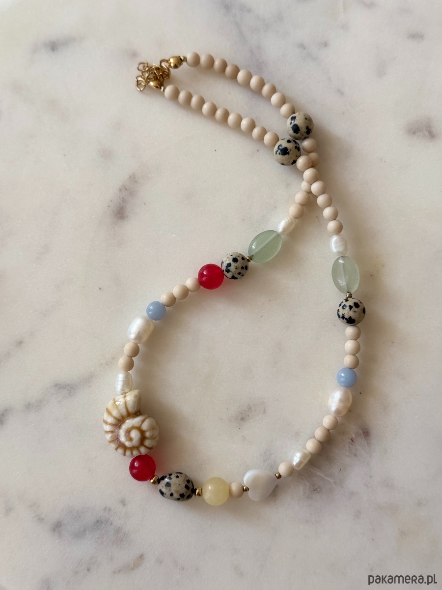 Jest zrobiony z jaspisu, jadeitu, awenturunu, angelitu, pereł i ceramicznej muszli, nawleczonych na żyłkę jubilerską.