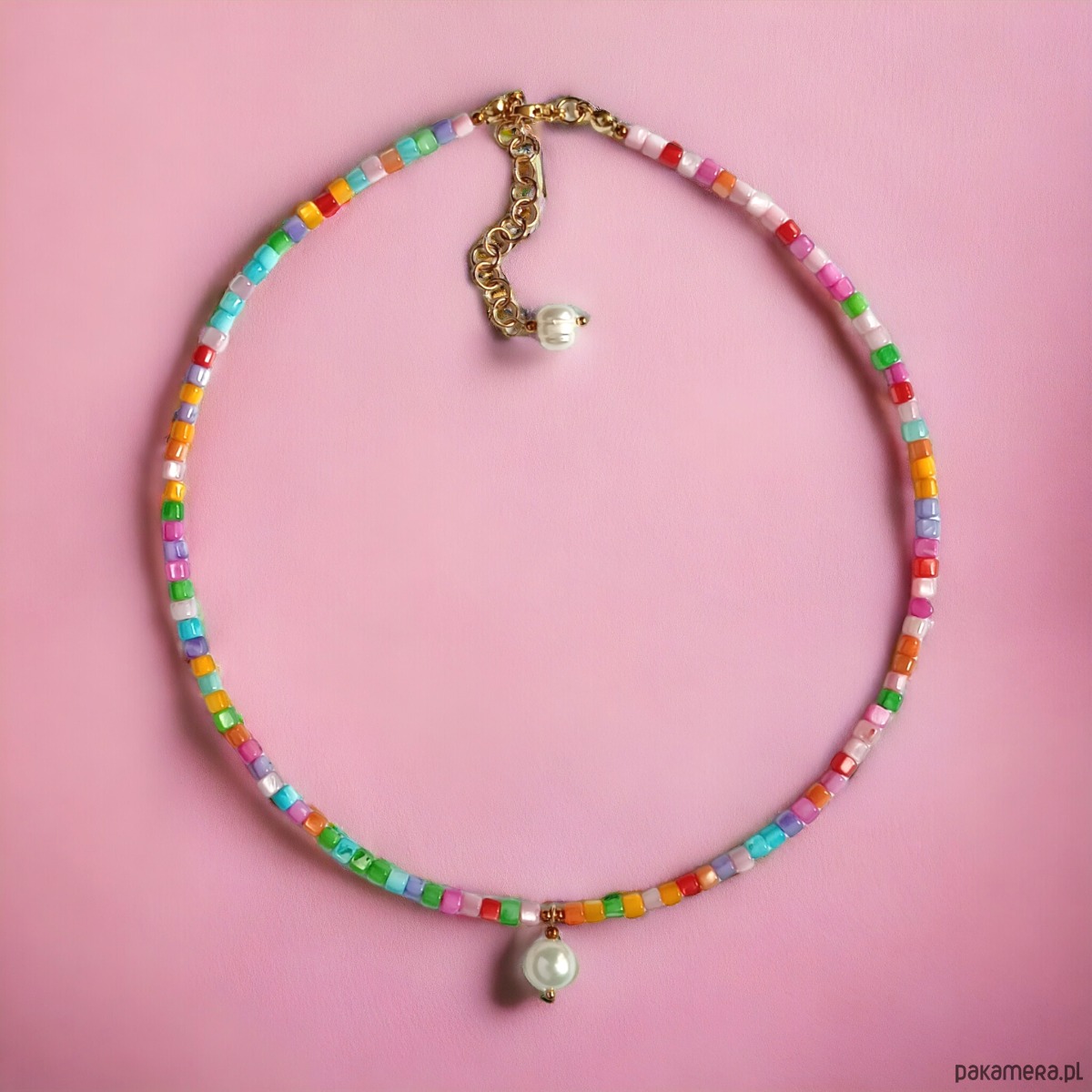 Naszyjnik na solidnej lince stalowej (miękkiej) - został wykonany z kolorowej muszli (wałeczki 3x4mm), przekładek ze złotego hematytu oraz naturalnych pereł słodkowodnych (10mm- w centrum i 7-8mm przy przedłużce).