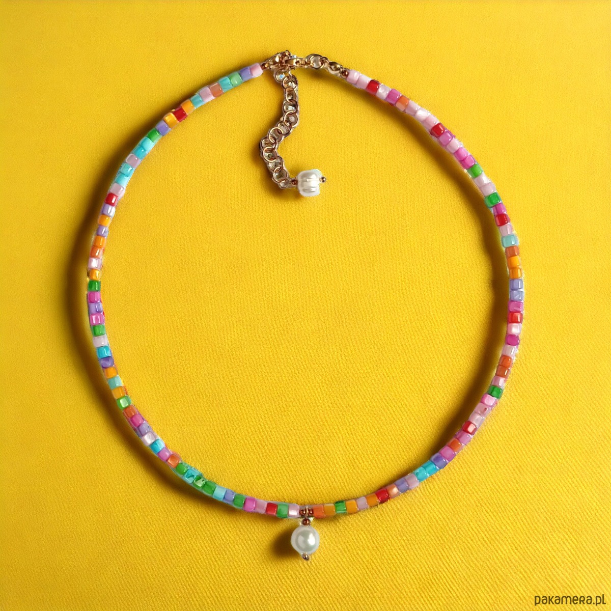Naszyjnik na solidnej lince stalowej (miękkiej) - został wykonany z kolorowej muszli (wałeczki 3x4mm), przekładek ze złotego hematytu oraz naturalnych pereł słodkowodnych (10mm- w centrum i 7-8mm przy przedłużce).