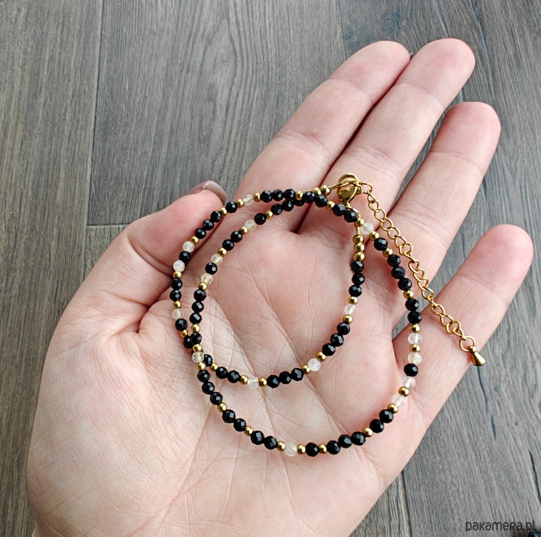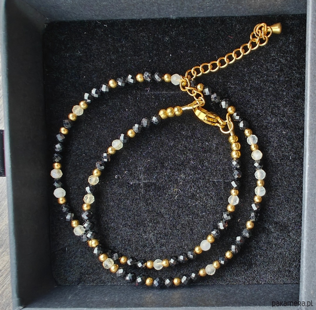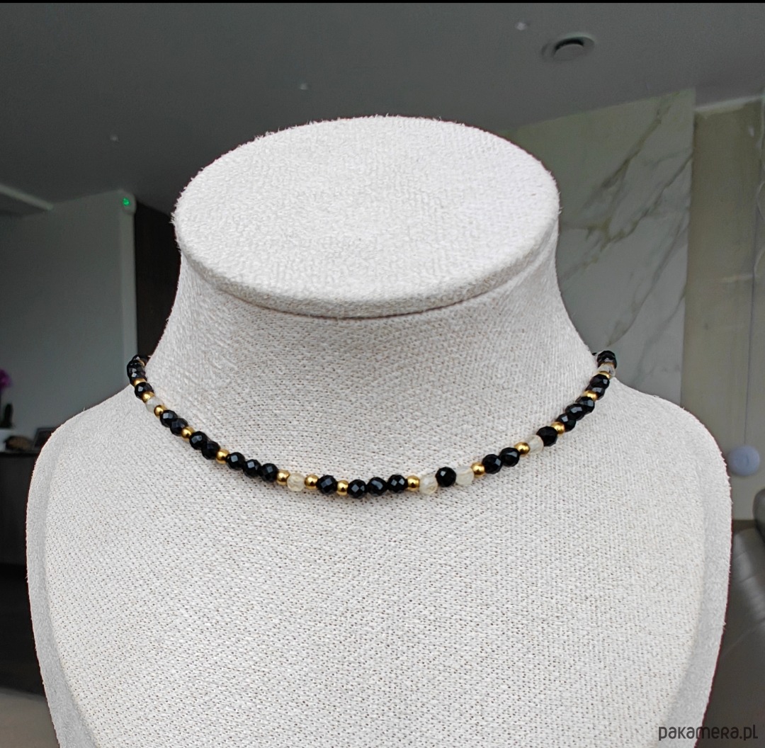 Choker wykonany z czarnego turmalinu i cytrynu to połączenie subtelnej elegancji i nowoczesnego charakteru. Długość naszyjnika wynosi 34 cm, a dodatkowy łańcuszek regulacyjny (6 cm) pozwala idealnie dopasować go do szyi – zarówno jako klasyczny choker, jak i nieco dłuższy naszyjnik. Całość uzupełniają elementy ze stali chirurgicznej, które gwarantują trwałość i komfort noszenia. Naszyjnik pakowany jest w eleganckie pudełko, co sprawia, że doskonale nadaje się również na prezent. 🎁✨