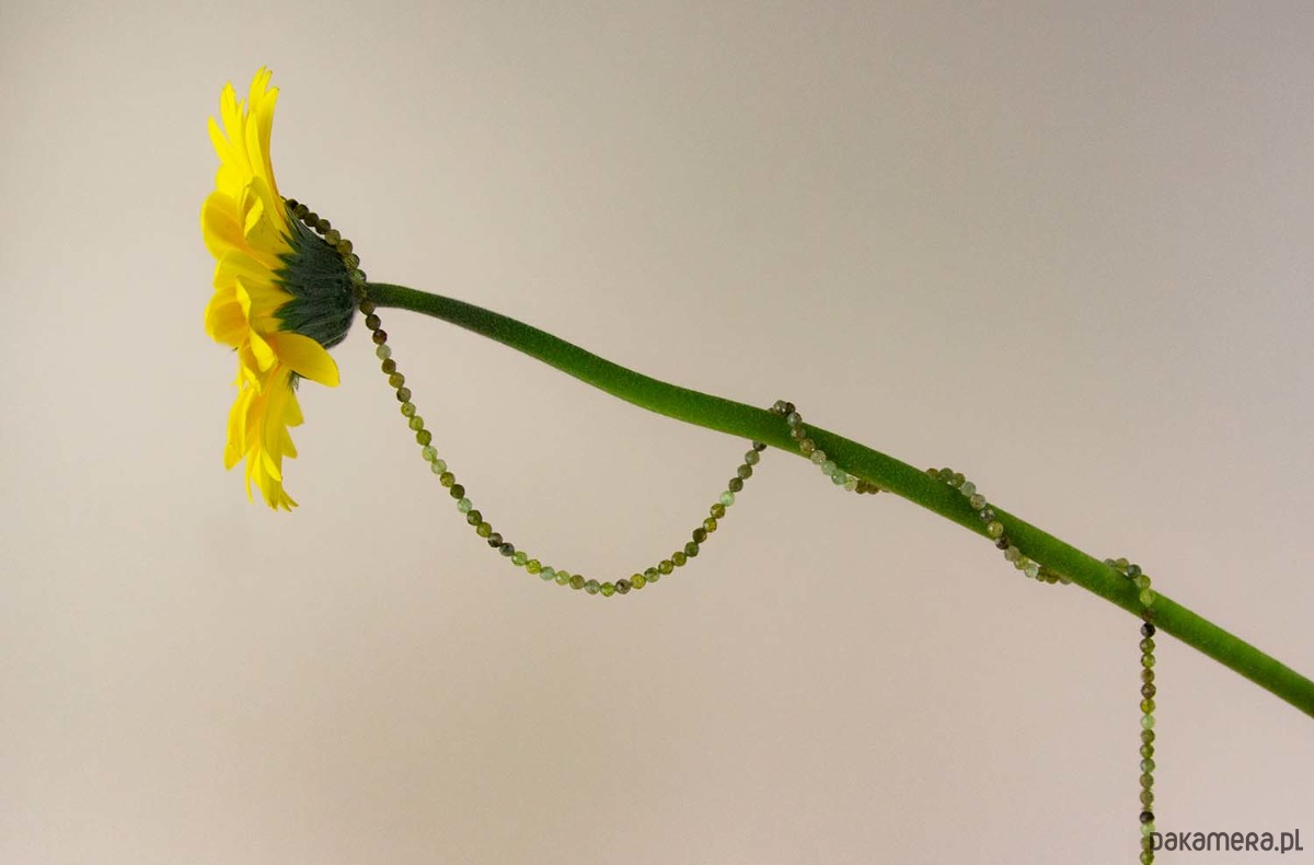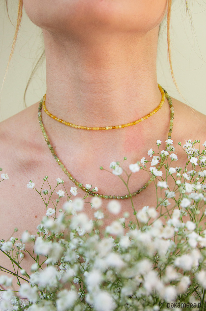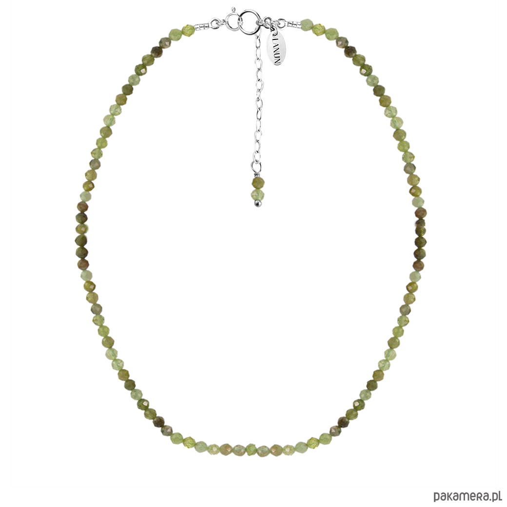 Choker wykonany jest z delikatnych zielonych kamieni (zielony granat), a w połączeniu ze srebrem próby 925 nadaje kobiecego uroku. Kamienie te są wykonane w szlifie fasetowym i mienią się w różnych odcieniach zieleni. Dodana jest również przedłużka tak aby każda osoba mogła dopasować sobie idealną długość. Kamienie użyte w naszyjniku dodają nam motywacji, pomagają uporać się z negatywnymi myślami oraz dodają radości.
