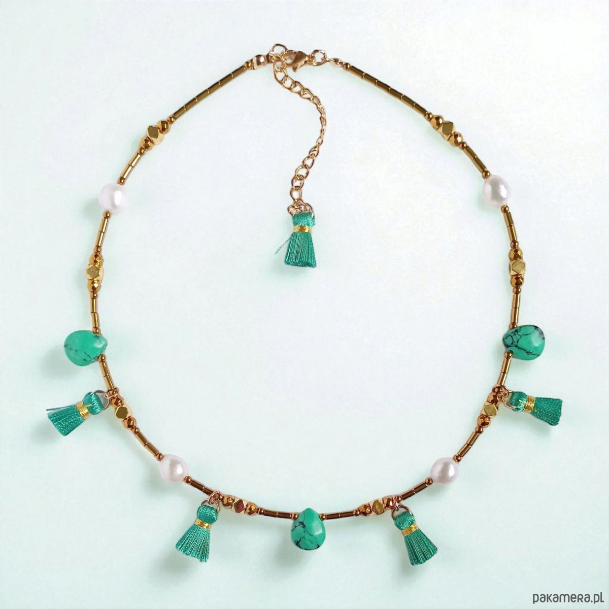 Choker wakacyjny : morska zieleń: perły, hematyt, howlit, chwosty