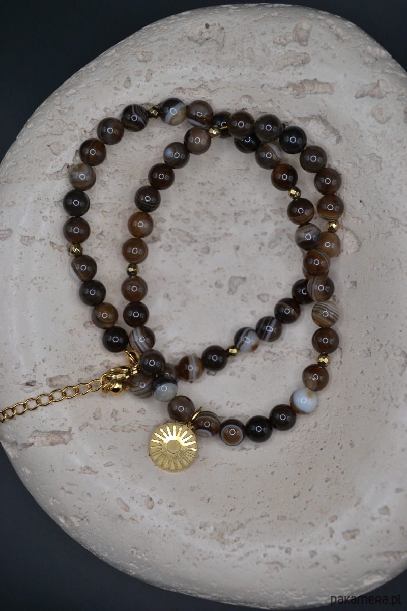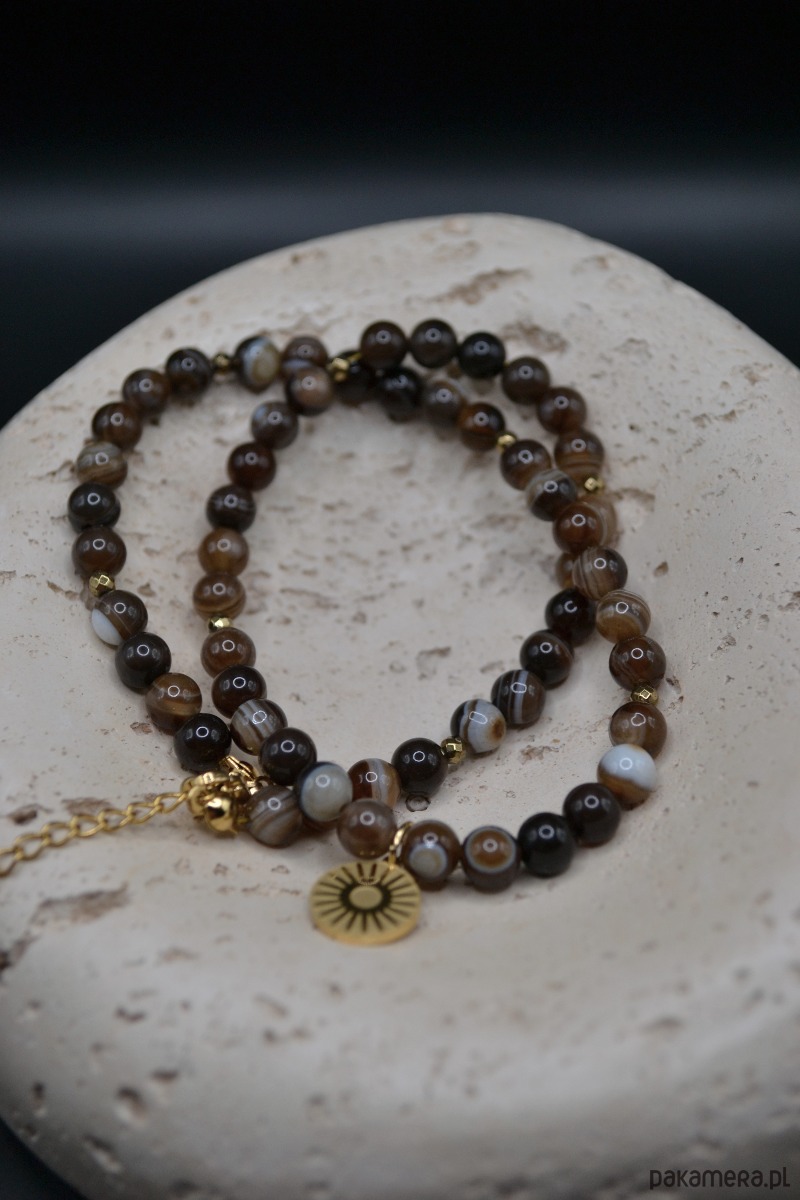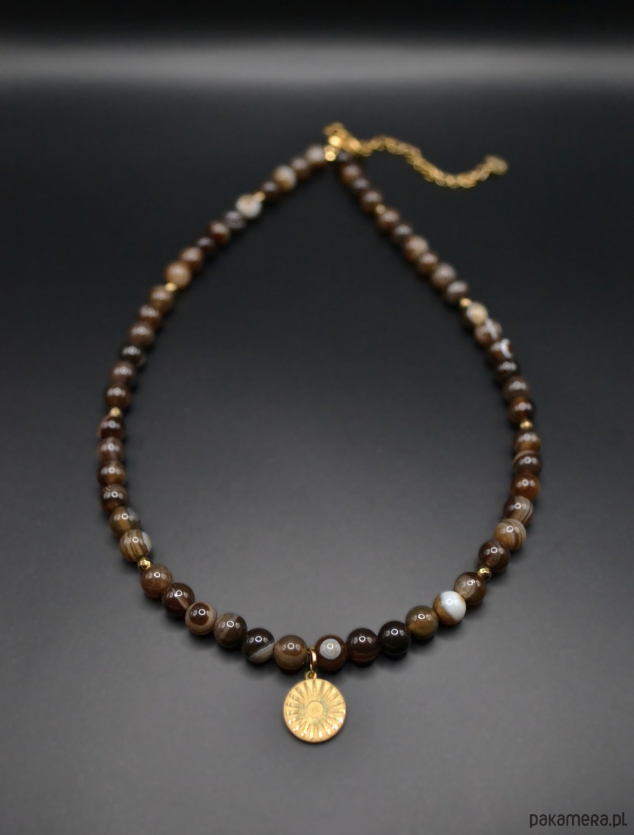 Naszyjnik typu choker z brązowego sardonyksu (odmiana agatu) z zawieszką ze stali szlachetnej z motywem Słońca.