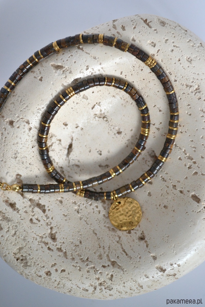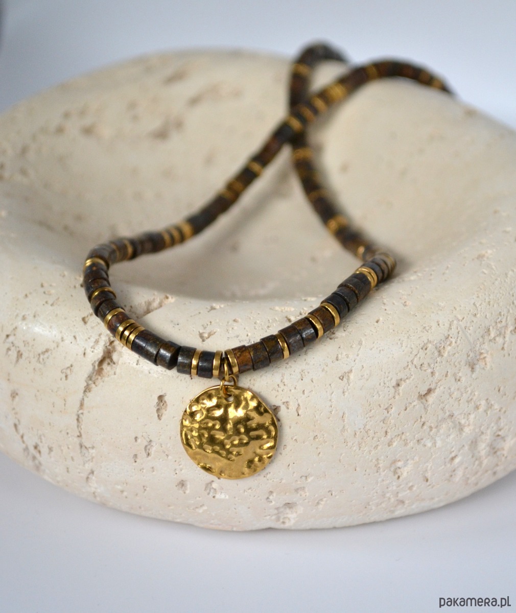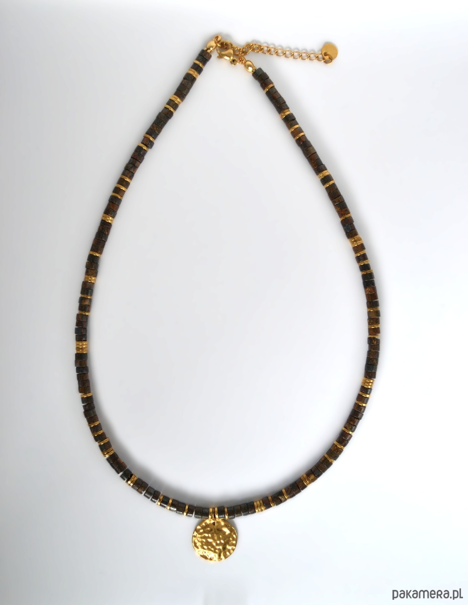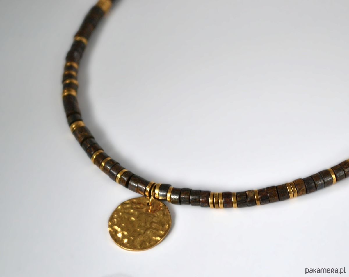 Naszyjnik typu choker z bronzytu w kształcie dysków z zawieszką ze stali szlachetnej w kolorze złotym.