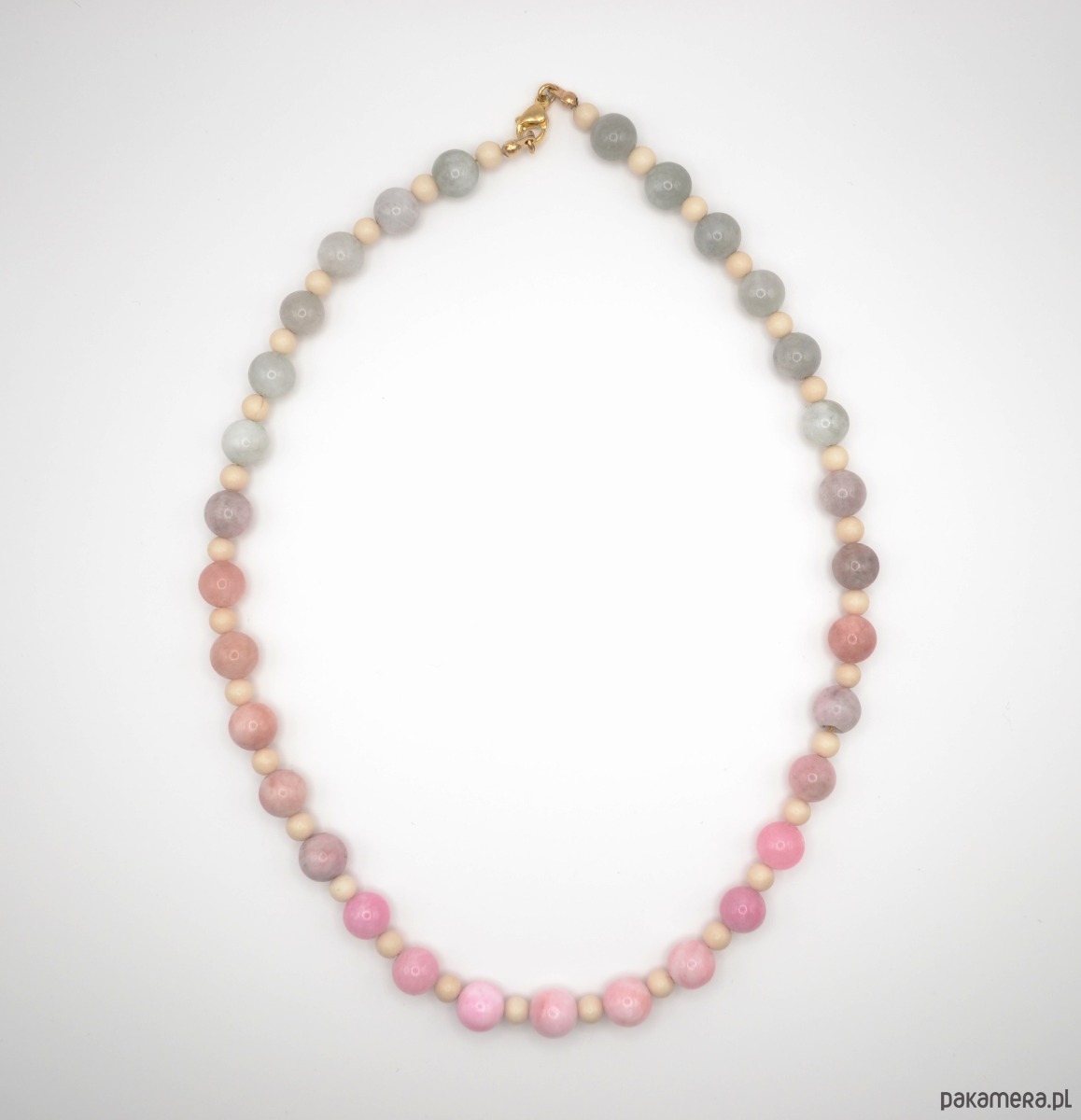 Naszyjnik typu choker z cieniowanego kolorowego morganitu, przekładanego kamieniem rzecznym.