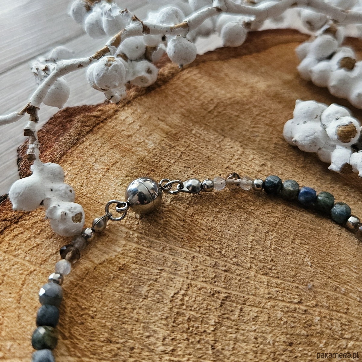 Materiały: kwarc dymny, labradoryt, dumortieryt – kamień naturalny, stal szlachetna (chirurgiczna), żyłka jubilerska