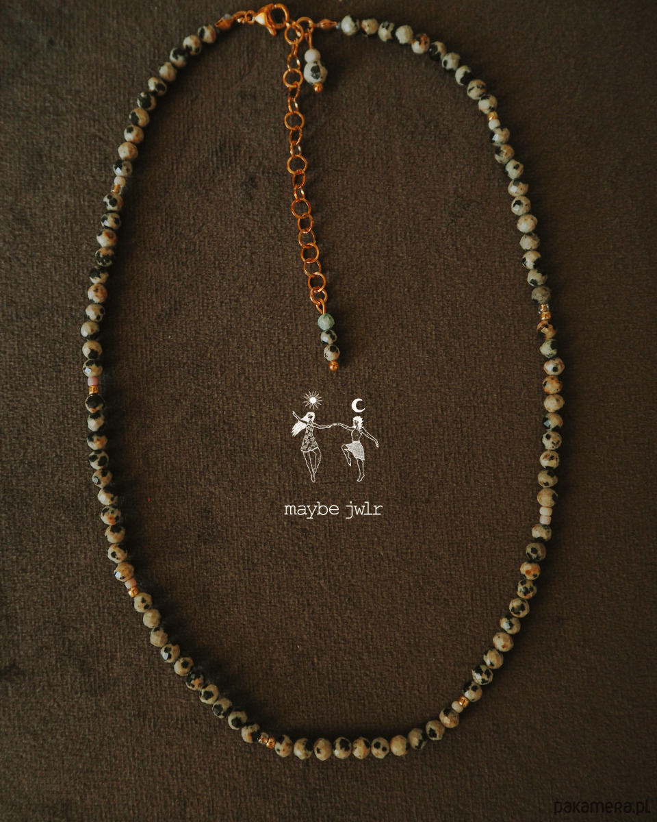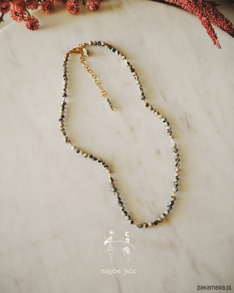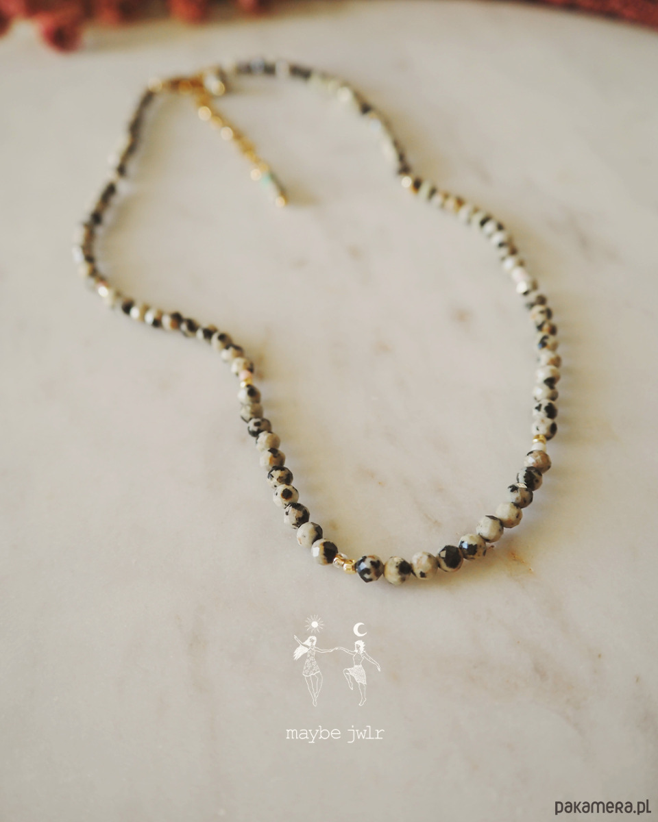 Elegancki naszyjnik z jaspisu dalmatyńskiego (4 mm) to biżuteria, która łączy wyjątkowy wygląd z pozytywnym wpływem kamienia na samopoczucie. Oszlifowane kamienie pięknie się błyszczą, a uniwersalny design pozwala nosić naszyjnik przodem lub tyłem, dopasowując go do każdej stylizacji.
