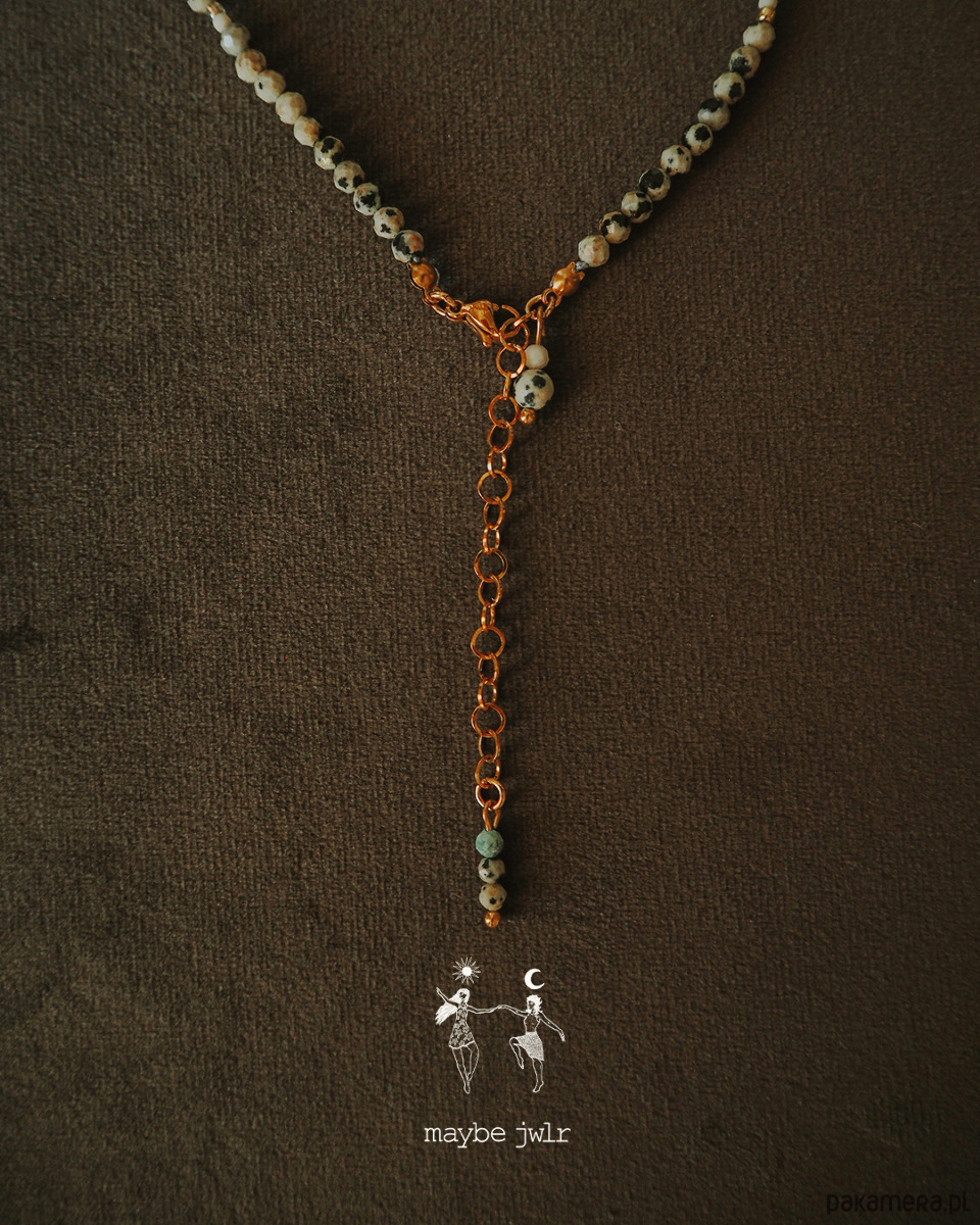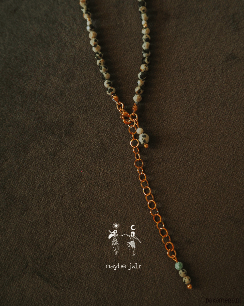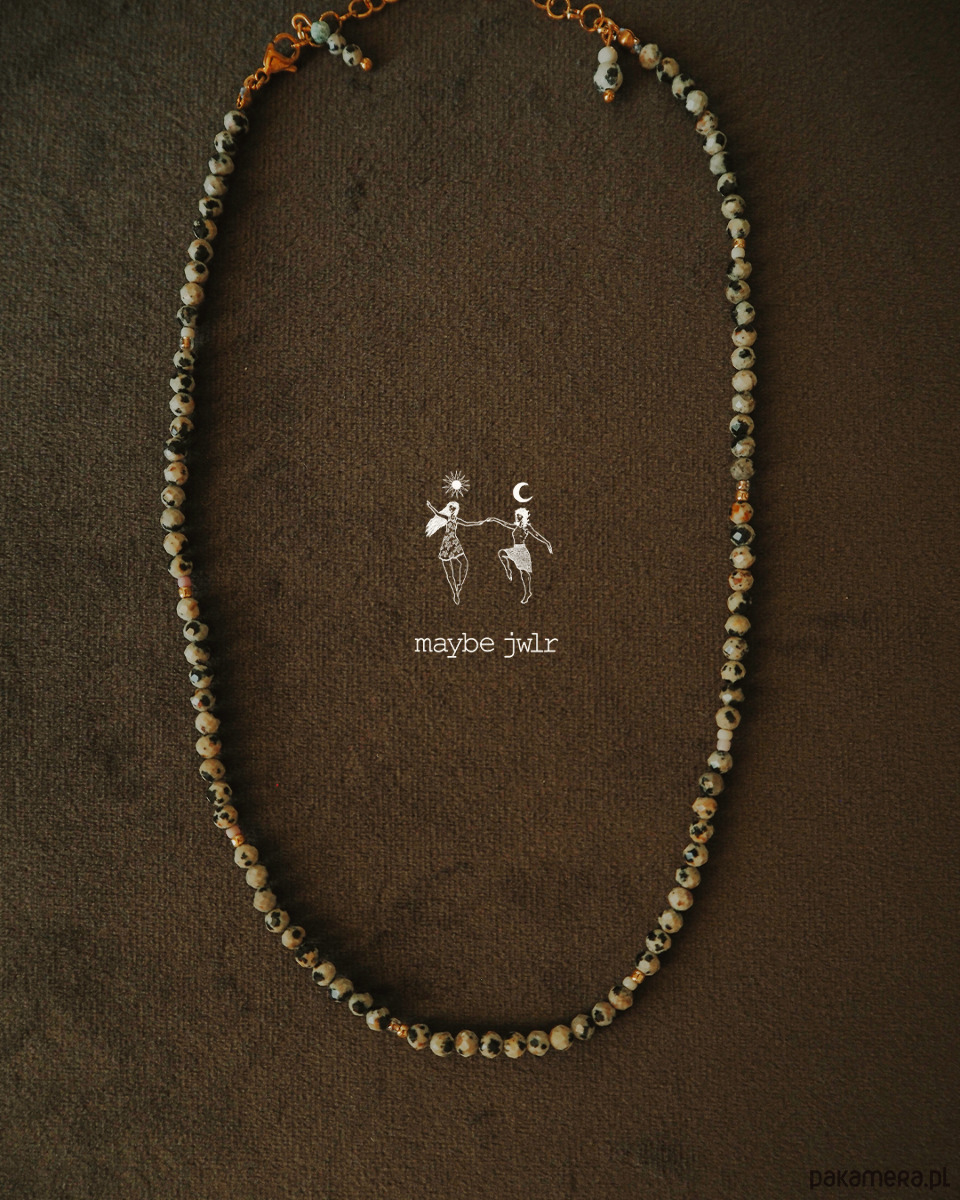 Elegancki naszyjnik z jaspisu dalmatyńskiego (4 mm) to biżuteria, która łączy wyjątkowy wygląd z pozytywnym wpływem kamienia na samopoczucie. Oszlifowane kamienie pięknie się błyszczą, a uniwersalny design pozwala nosić naszyjnik przodem lub tyłem, dopasowując go do każdej stylizacji.