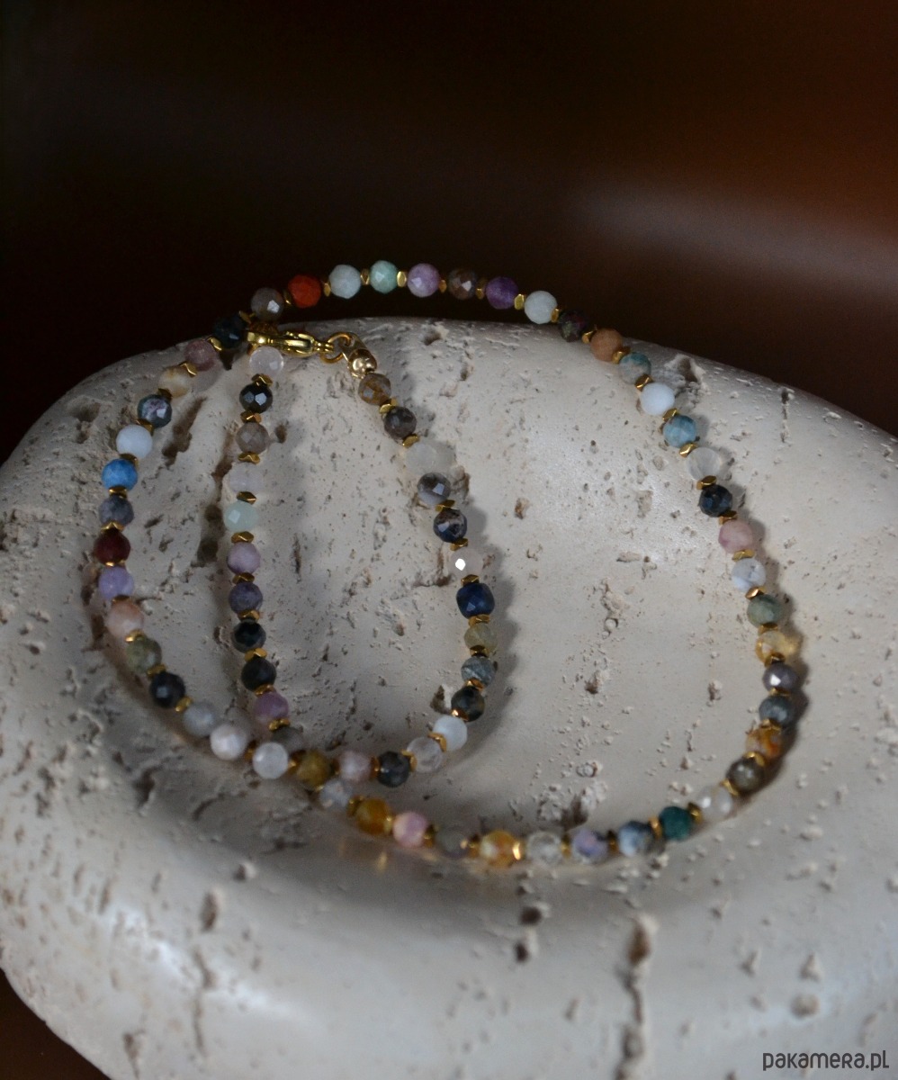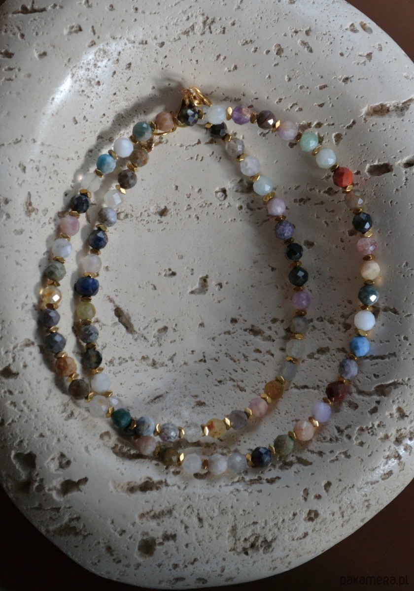 Naszyjnik typu choker z różnych kamieni: agat, ametyst, jadeit, morganit, lapis, turkus, rodonit, kryształ górski. Przekładka z hematytu w kolorze złotym.