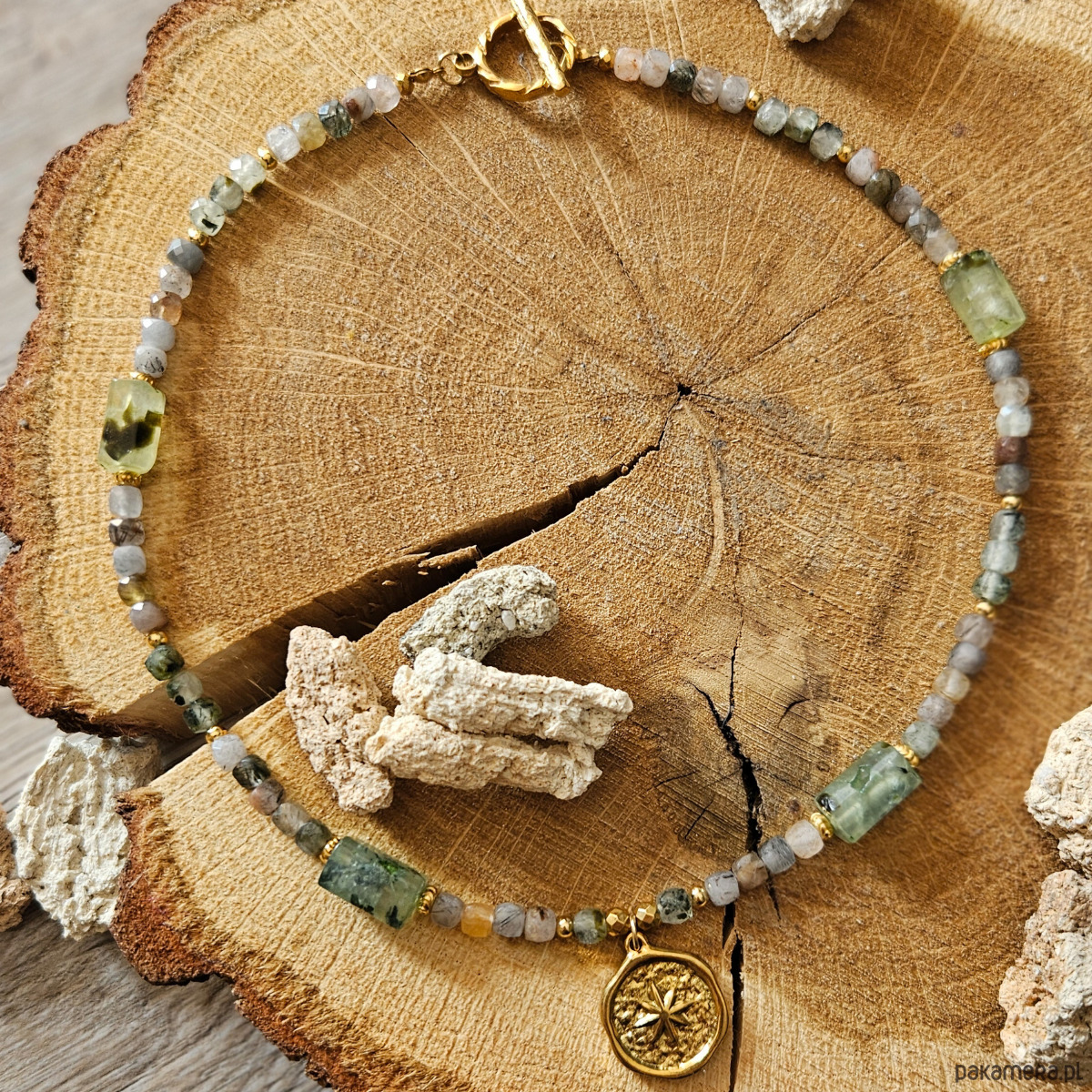 Jeden z najgorętszych obecnie trendów biżuteryjnych – choker z minerałami idealnymi na wiosnę! Ten bogato zdobiony naszyjnik łączy w sobie delikatność minerałów i pastelowych barw oraz mocne akcenty w postaci modnych elementów ze stali szlachetnej. Znajdziesz tu kombinację kwarcu i frenitu – pięknie połyskujących kamieni, których mineralne wrostki tworzą niesamowity spektakl będący dziełem natury. Frenit występuje tu także w formie większych, nieregularnych bryłek, nadających całości trójwymiarowego charakteru. Zawieszka z motywem róży wiatrów jest wisienką na torcie i sprawia, że choker będzie naprawdę przyciągającym wzrok elementem Twoich wiosennych stylizacji!