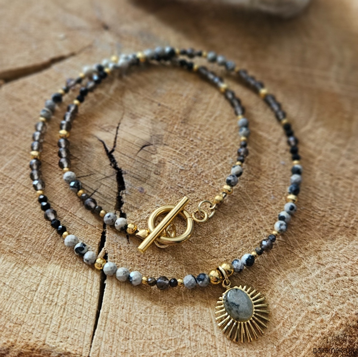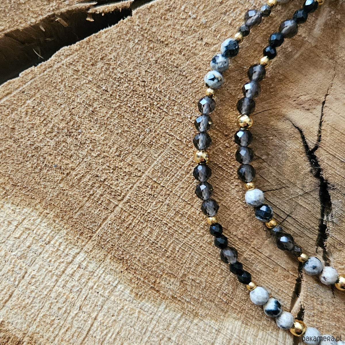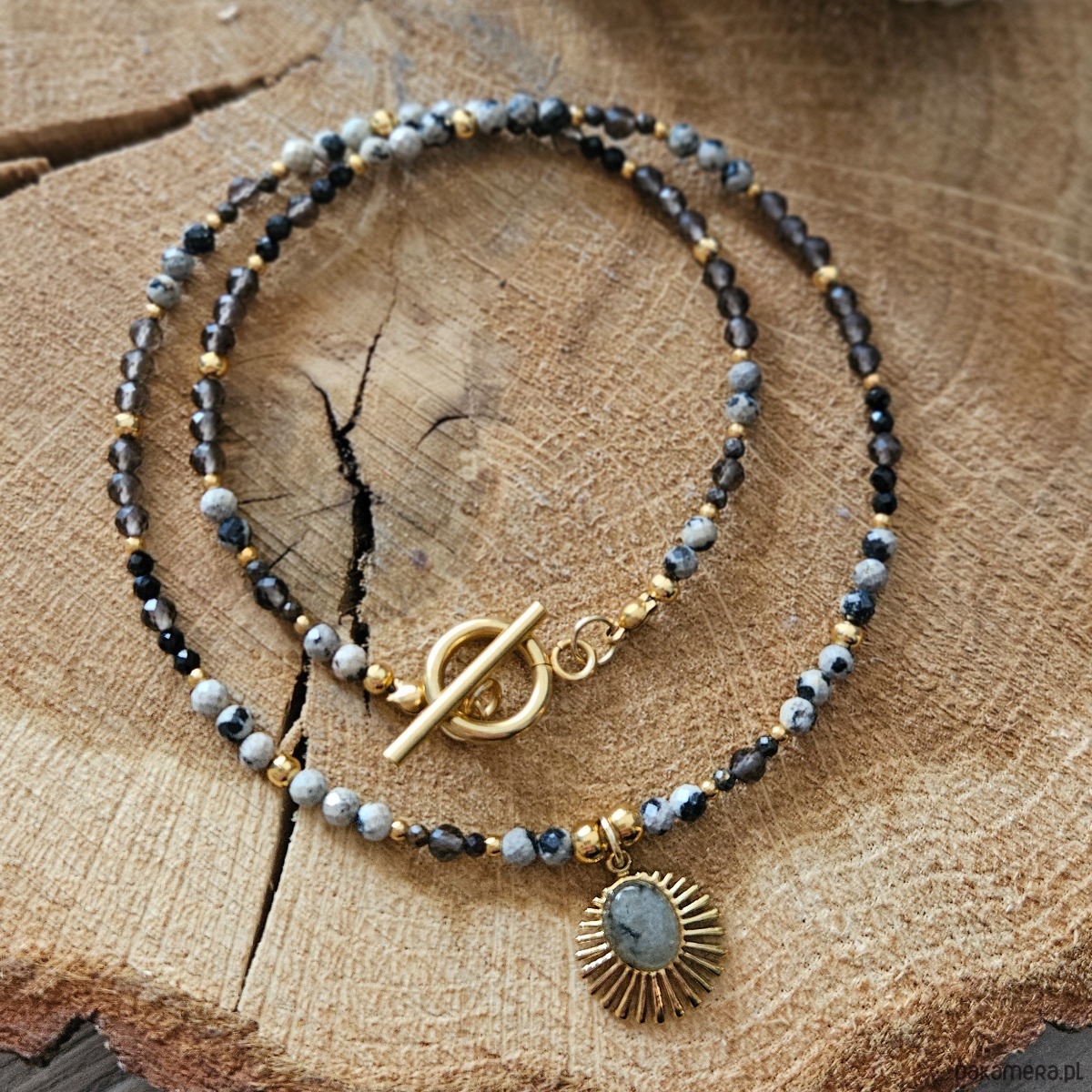 Zjawiskowy choker o niezwykłej mocy minerałów. Spotykają się tu fasetowane koraliki jaspisu dalmatyńskiego, kwarc dymnego, czarnego turmalinu i bronzytu, a całość zwieńczona jest piękną zawieszką z labradorytem w okuciu. Kamienie uzupełnione zostały dodatkami ze stali szlachetnej i modnym zapięciem toggle.