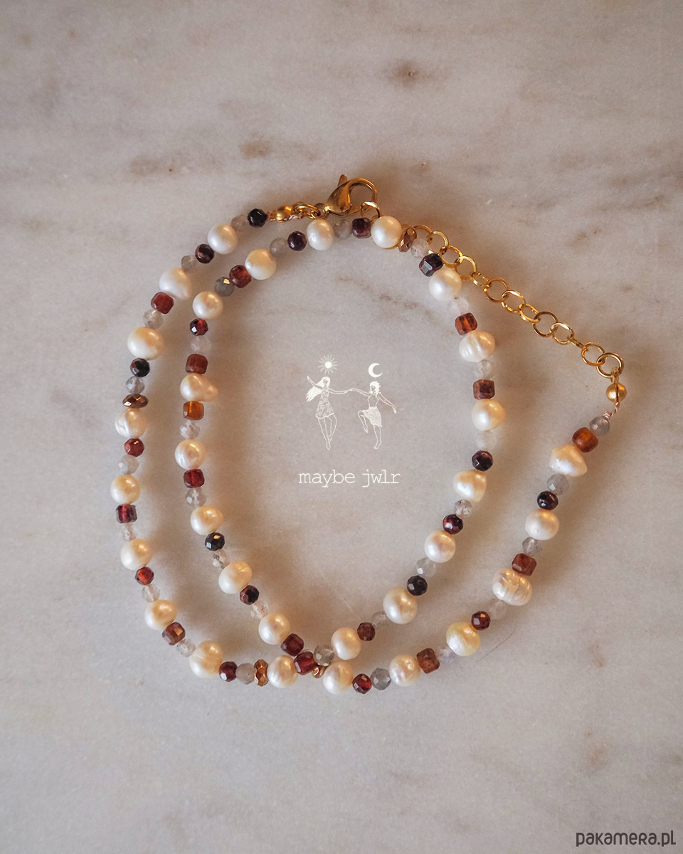 Poznaj naszyjnik, który łączy subtelność pereł z energią naturalnych kamieni. To delikatny choker o długości 38 cm z regulacją, dzięki której dopasujesz go idealnie do siebie. Całość została wykonana ręcznie, a metalowe elementy to stal chirurgiczna – trwała, hipoalergiczna i przyjazna dla skóry.