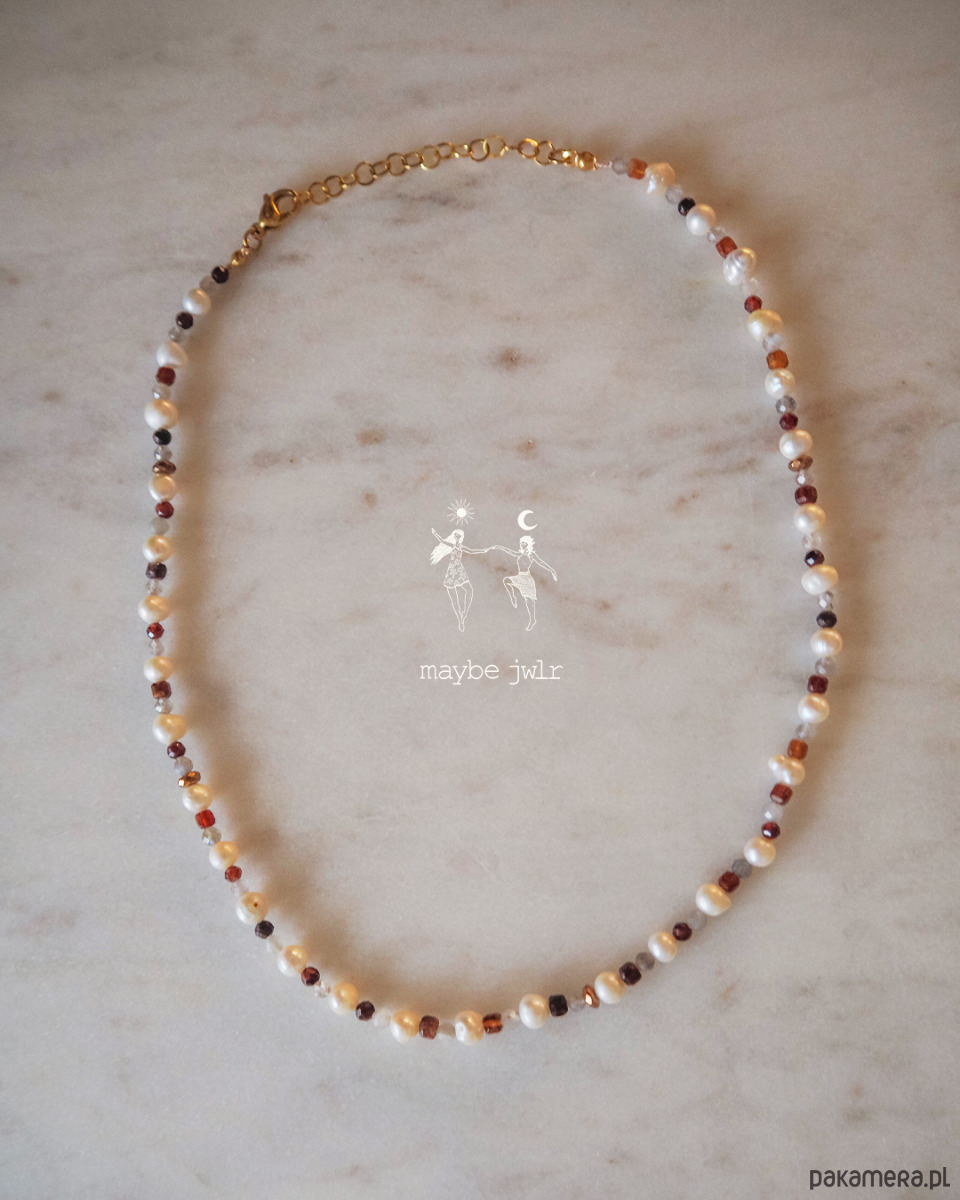 Poznaj naszyjnik, który łączy subtelność pereł z energią naturalnych kamieni. To delikatny choker o długości 38 cm z regulacją, dzięki której dopasujesz go idealnie do siebie. Całość została wykonana ręcznie, a metalowe elementy to stal chirurgiczna – trwała, hipoalergiczna i przyjazna dla skóry.