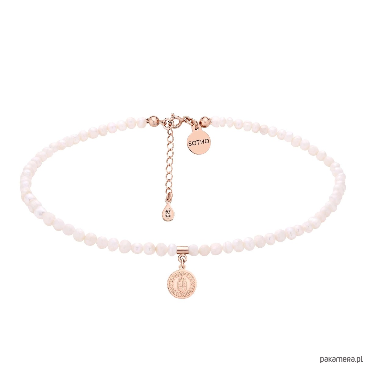 Złoty choker wykonany z naturalnych pereł słodkowodnych, zdobiony medalionem i logo marki. Wszystkie elementy wykonane ze srebra 925 powlekanego 18 karatowym różowym złotem. Perły są nieregularne, unikatowe, delikatnie różnią się od siebie i mogą różnić się od tych na zdjęciu.