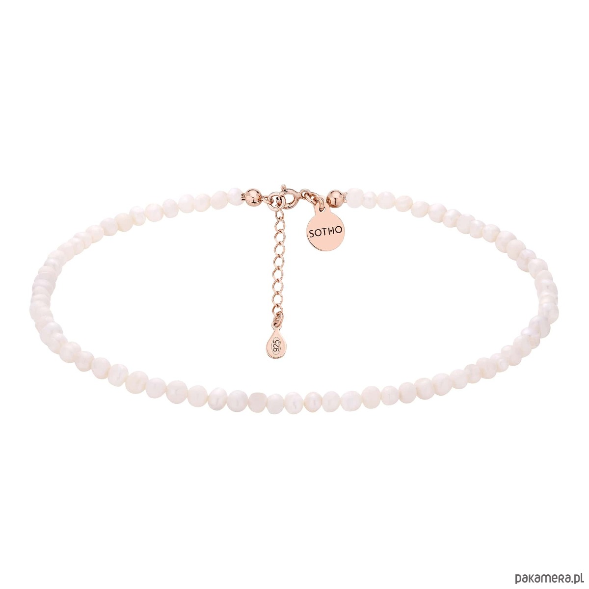 Złoty choker wykonany z naturalnych pereł słodkowodnych. Wszystkie elementy wykonane ze srebra 925 powlekanego 18 karatowym różowym złotem. Perły są nieregularne, unikatowe, delikatnie różnią się od siebie i mogą różnić się od tych na zdjęciu.