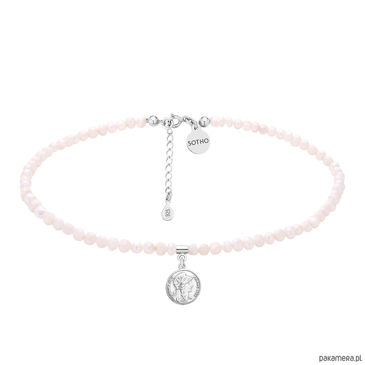 Srebrny choker wykonany z naturalnych pereł słodkowodnych, zdobiony monetą i logo marki. Wszystkie elementy wykonane ze srebra 925. Perły są nieregularne, unikatowe, delikatnie różnią się od siebie i mogą różnić się od tych na zdjęciu.