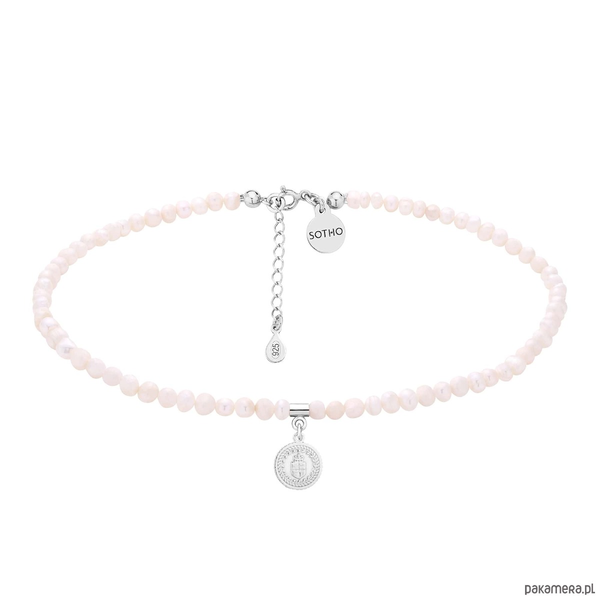 Srebrny choker wykonany z naturalnych pereł słodkowodnych, zdobiony medalionem i logo marki. Wszystkie elementy wykonane ze srebra 925. Perły są nieregularne, unikatowe, delikatnie różnią się od siebie i mogą różnić się od tych na zdjęciu.