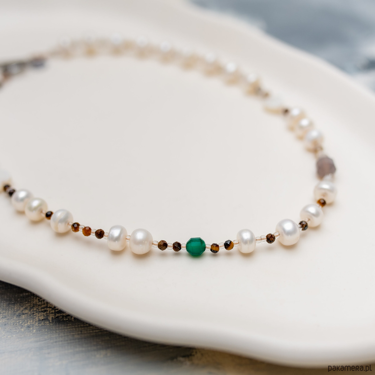 Użyte materiały: Perła, Zielony Onyks, Agat Szary, Tygrysie Oko, Selenit (Kamień Księżycowy), Japońskie Szkło, Nylon, Stal Chirurgiczna.