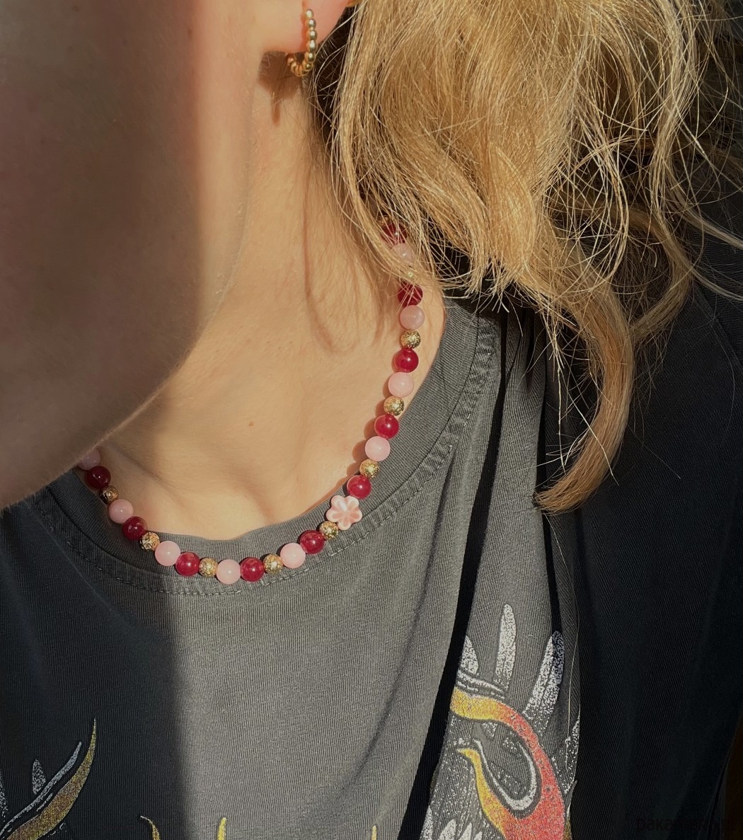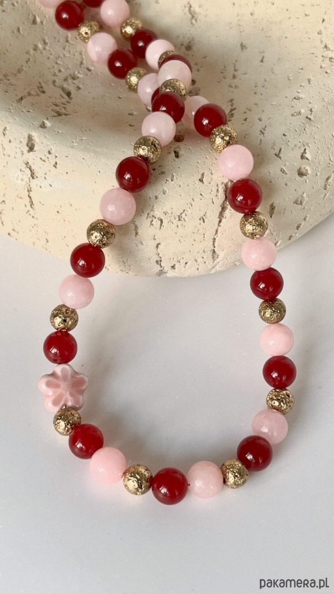 Naszyjnik typu choker z różowego jadeitu, granatu i lawy platerowanej na złoto. Przekładka kwiat z ceramiki.