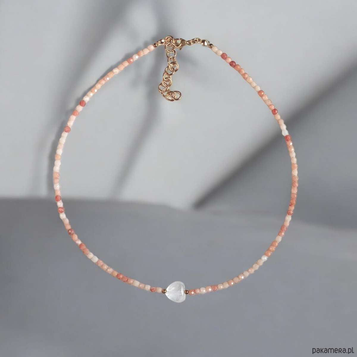 Minimalistyczny naszyjnik na solidnej lince stalowej (miękkiej) - został wykonany z fasetowanych kuleczek awenturynu łososiowego 3mm oraz serduszka z kryształu górskiego i przekładek ze złotego hematytu.