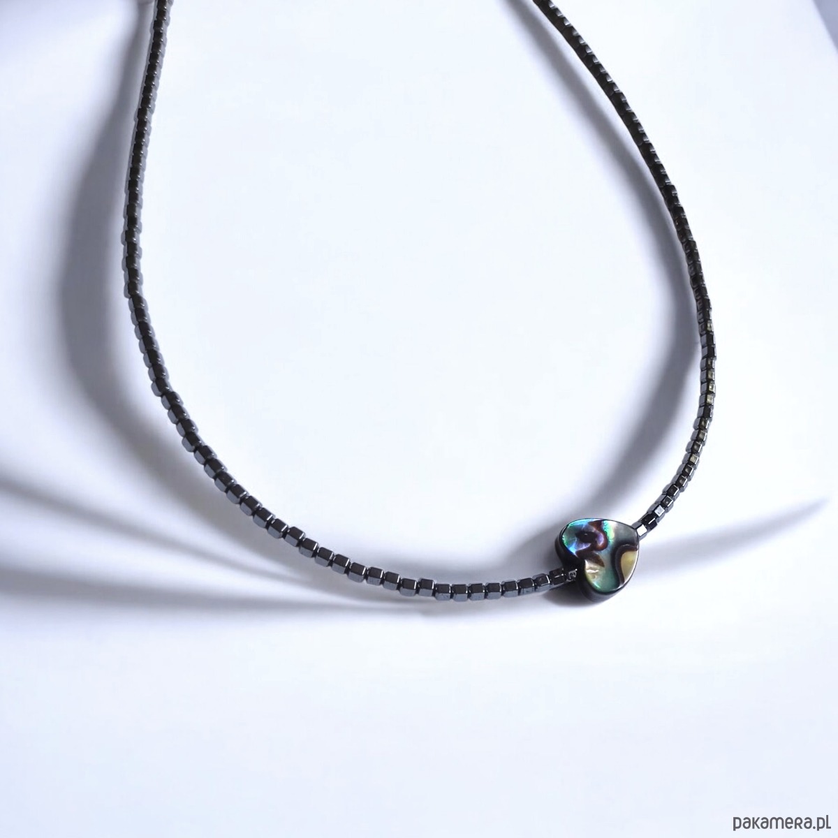 Choker z serduszkiem : muszla PAUA, hematyt grafitowy