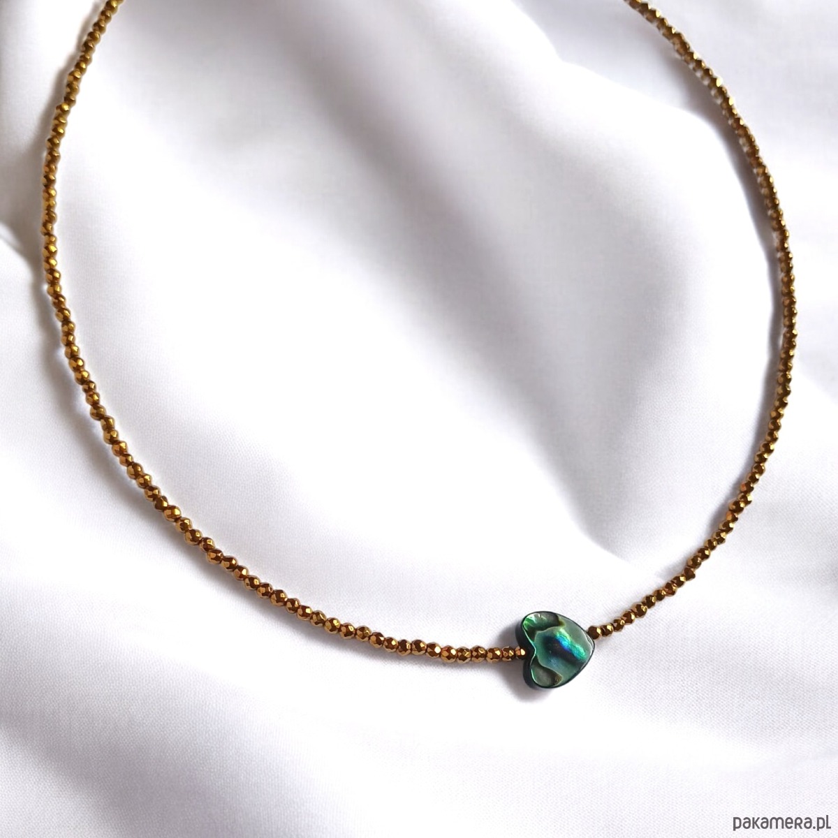 Choker z serduszkiem : muszla PAUA, hematyt złoty