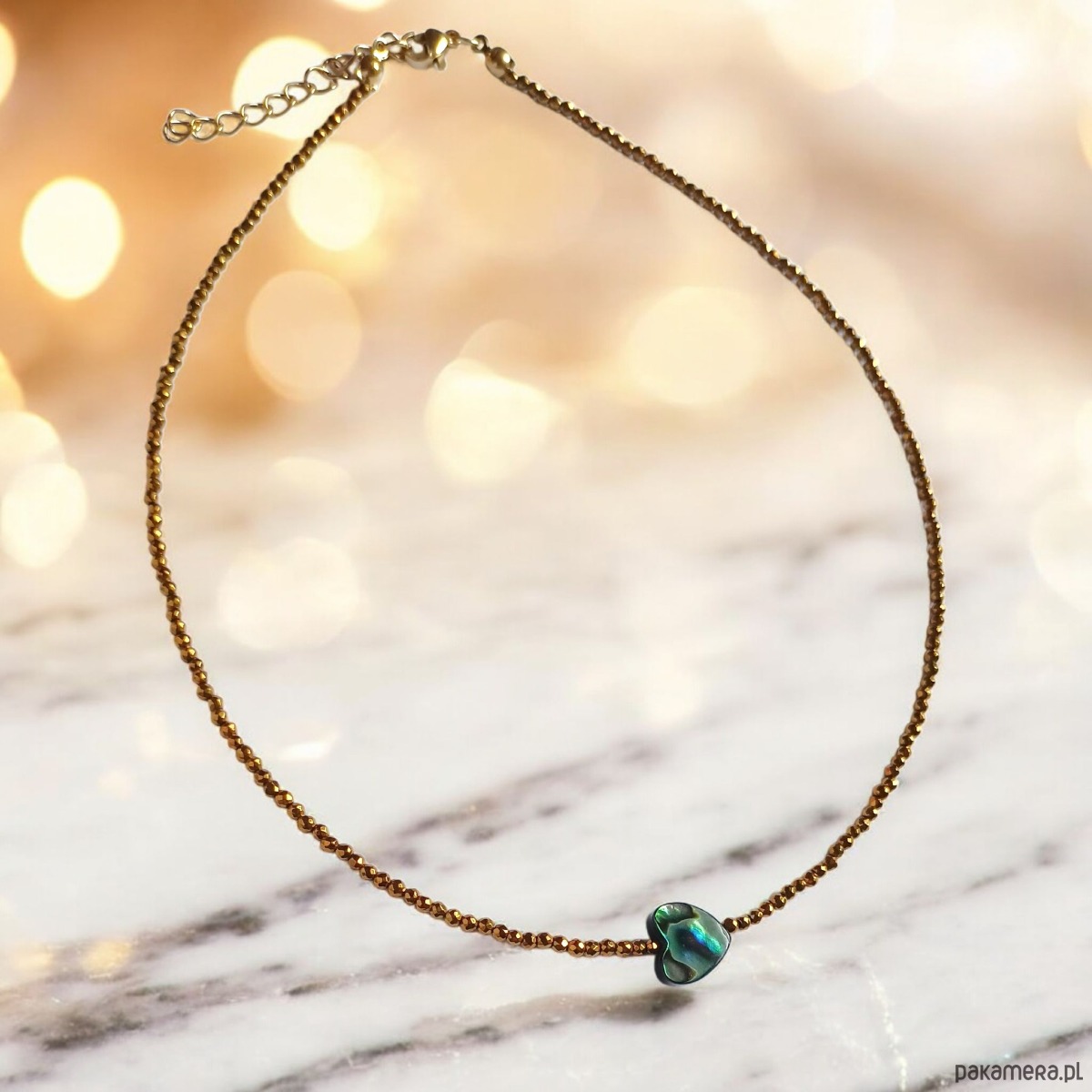 na solidnej lince stalowej (miękkiej) - został wykonany z serduszka z muszli paua 10mm (pięknie opalizuje w świetle naturalnym i sztucznym! ) oraz drobniutkich kuleczek fasetowanego hematytu złotego (niecałe 2mm).