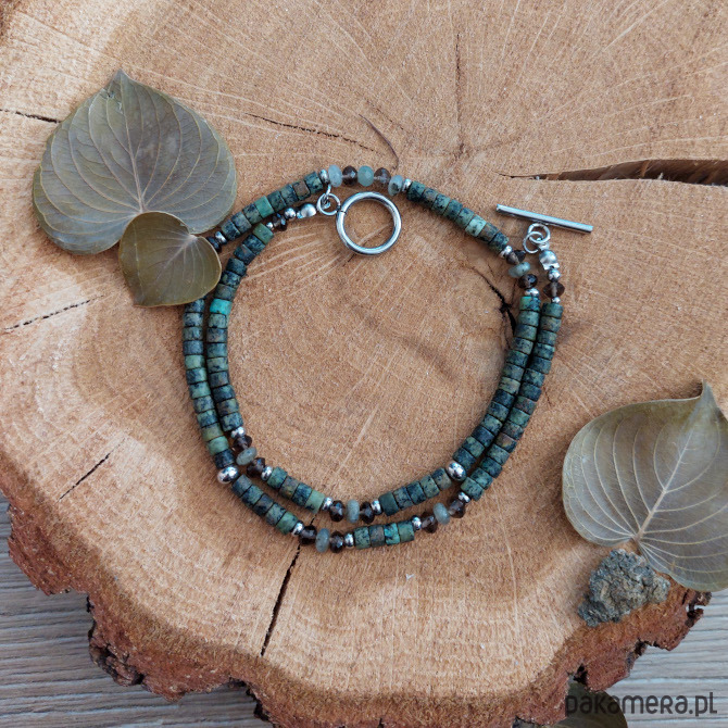 Zastosowane materiały: kamienie półszlachetne (kwarc dymny, labradoryt, turkus afrykański), stal szlachetna (chirurgiczna)