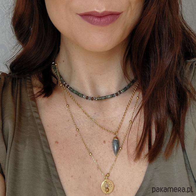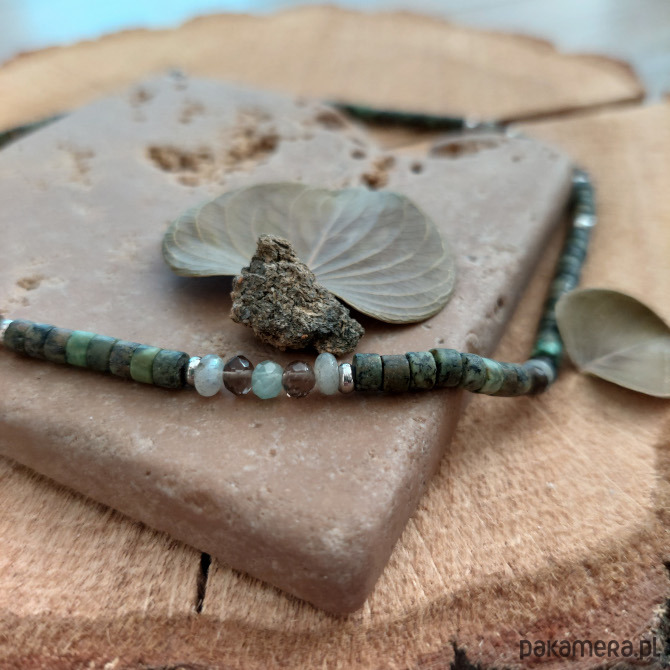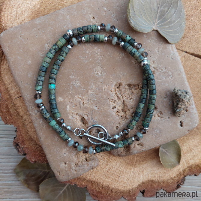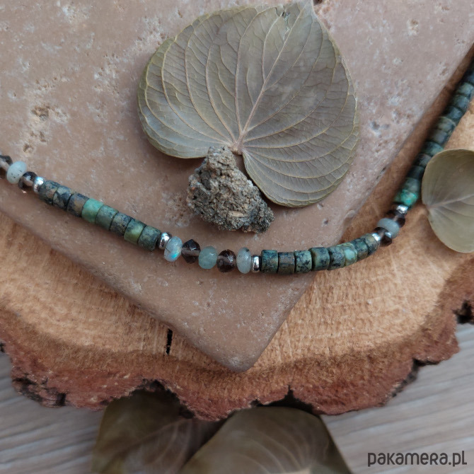 Jeden z najgorętszych obecnie trendów biżuteryjnych - choker wykonany z turkusu afrykańskiego, labradorytu i kwarcu dymnego! Ten zjawiskowy naszyjnik zachwyca nieregularnością faktur i kształtów, podkręcając każdą, nawet casualową stylizację! Choker uzupełniony został modnym, geometrycznym zapięciem typu toggle oraz dodatkami ze stali szlachetnej. Warto dodać, że stal szlachetna jest bezpieczna także dla alergików - nie zawiera niklu i nie powoduje uczuleń.