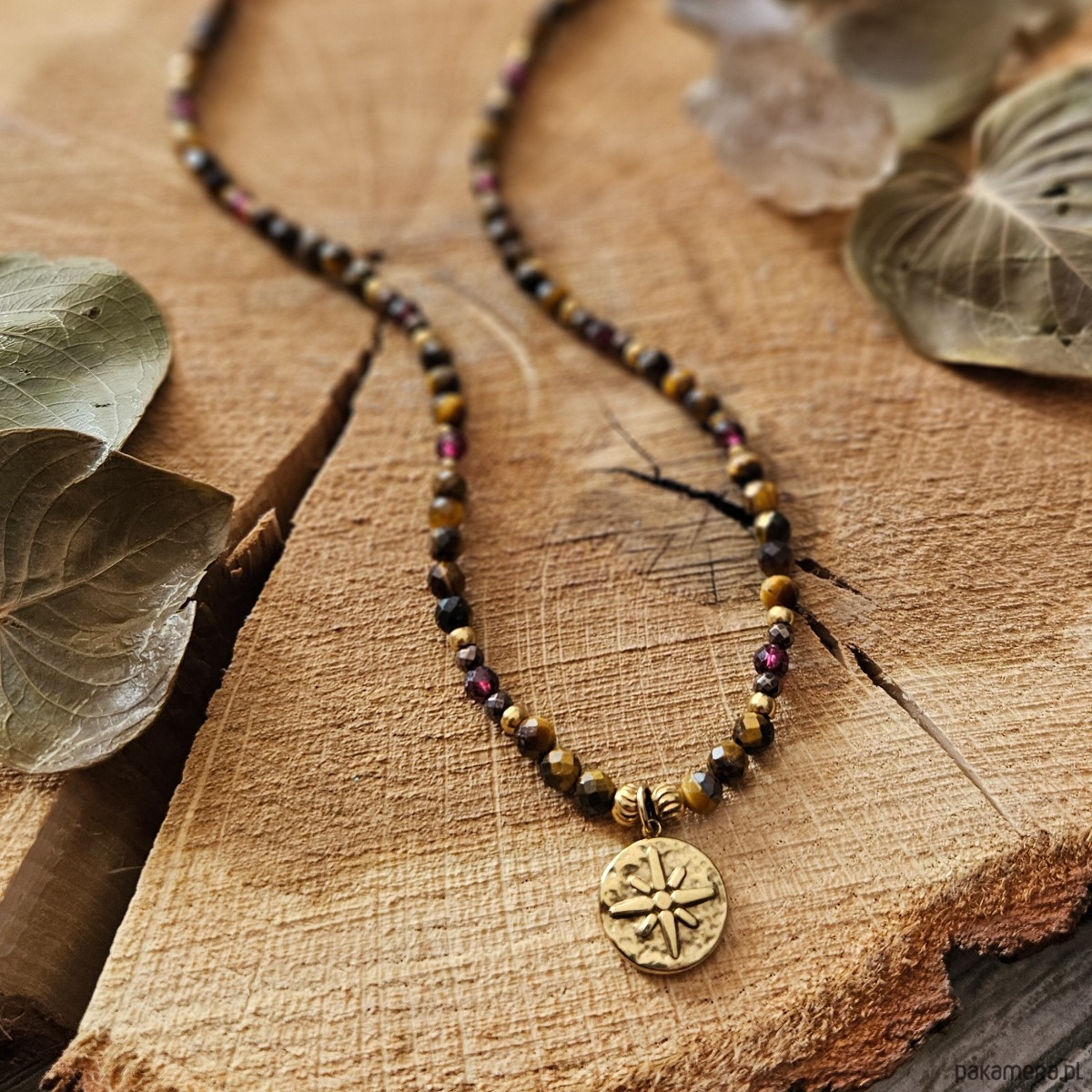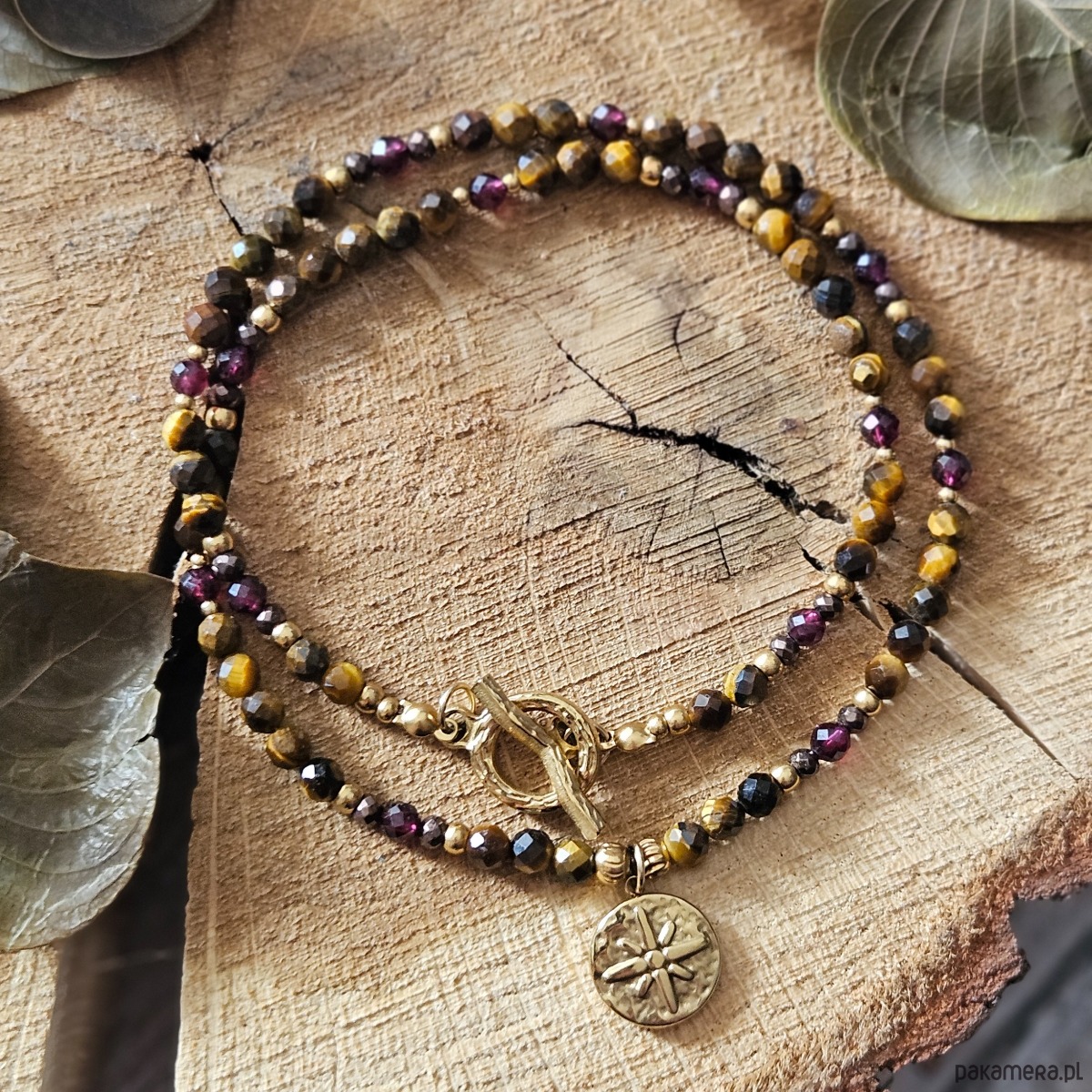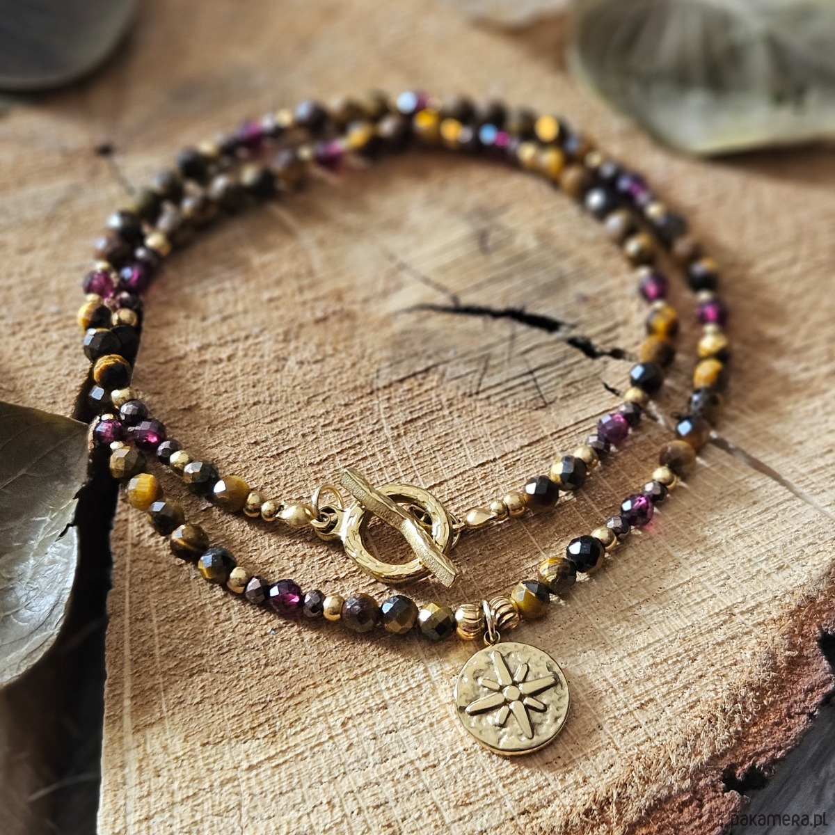 Jeden z najgorętszych obecnie trendów biżuteryjnych - choker z zawieszką oraz tygrysim okiem, granatem i hematytem! Ten zjawiskowy naszyjnik zachwyca jesiennymi kolorami, podkręcając każdą, nawet casualową stylizację! Choker uzupełniony został modnym zapięciem typu toggle o pięknej, rzeźbionej fakturze oraz dodatkami ze stali szlachetnej. Świetnie skomponuje się z jesiennymi swetrami, uzupełni stylizacje w odcieniach czekoladowego brązu, karmelu, bordo i wielu innych!