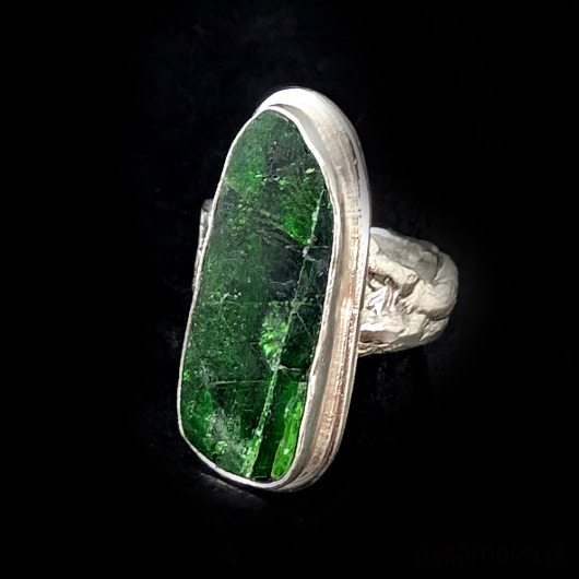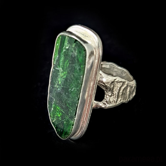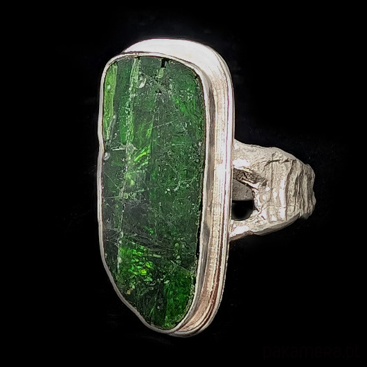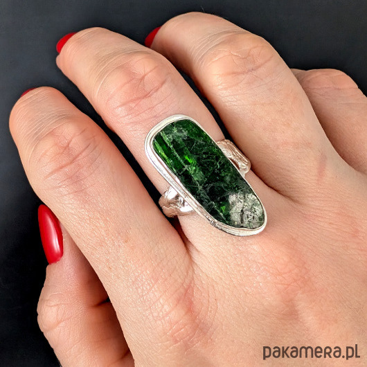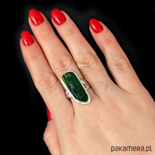 Zjawiskowy pierścień z przepięknym, rzadkim i efektownym chromodiopsydem oprawionym w srebro próby 925.Waży 10 g. Wymiary oprawy kamienia 30 x 13 mm. Rozmiar jubilerski 17, mogę powiększyć na max 18. Pierścień zostanie zapakowany w ozdobne pudełeczko. I