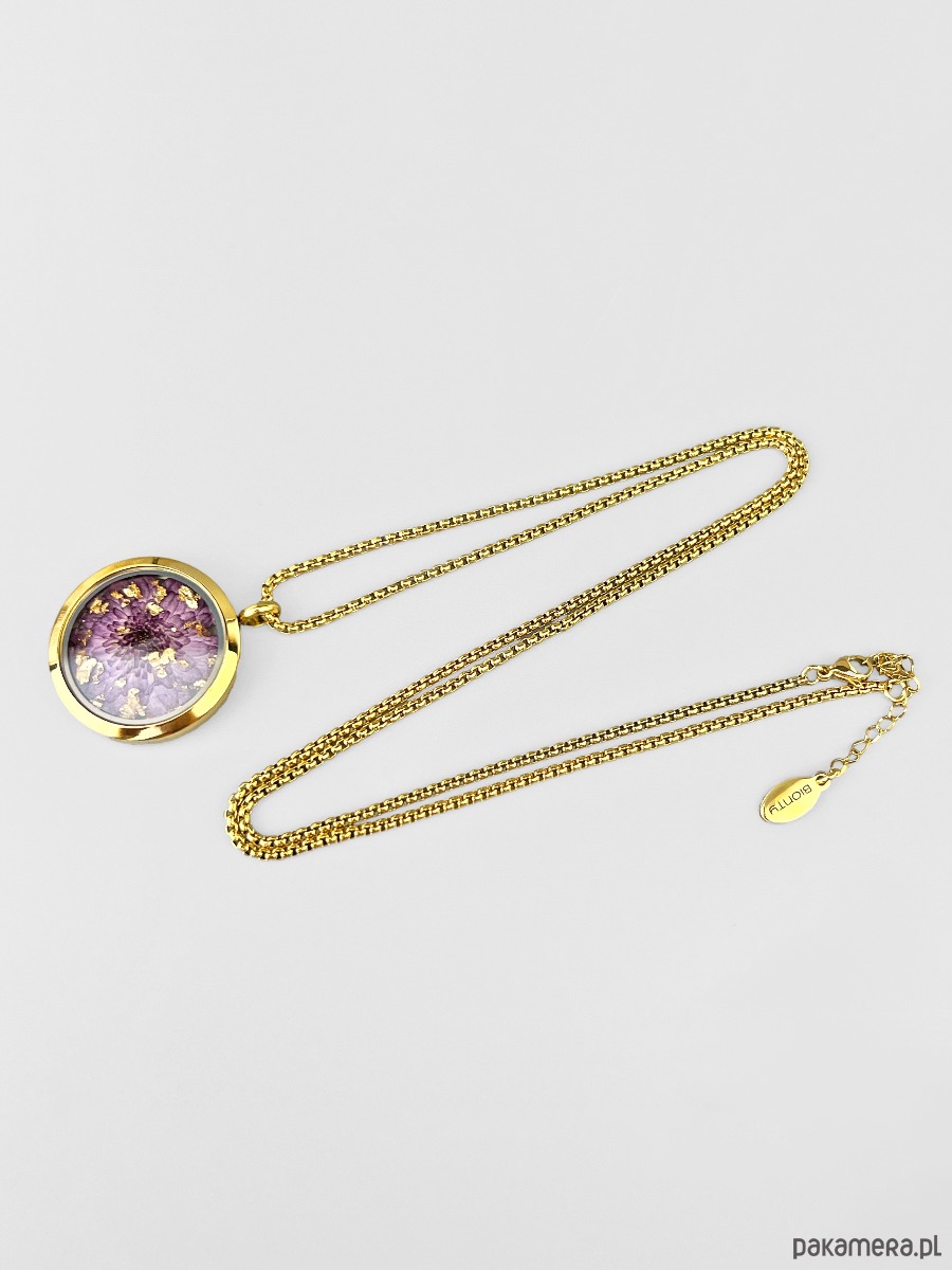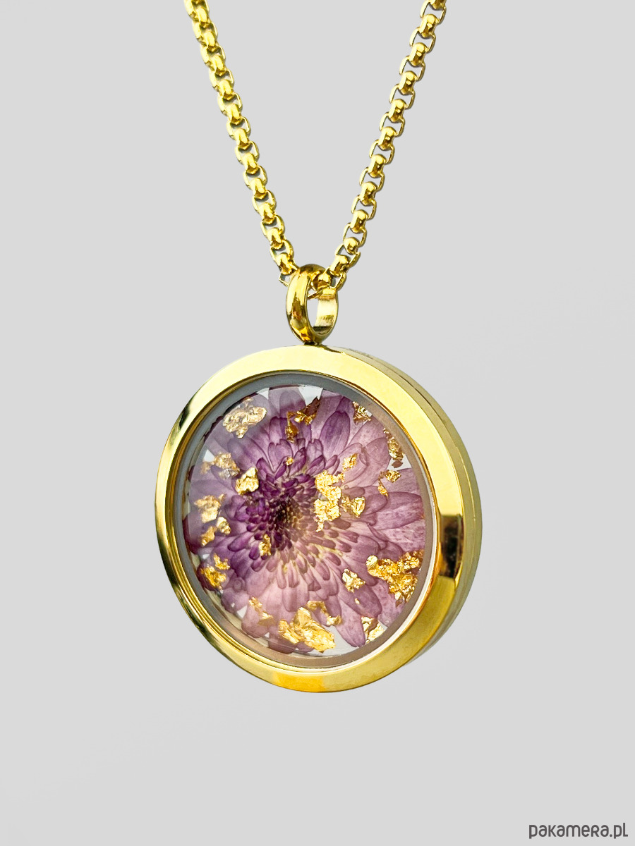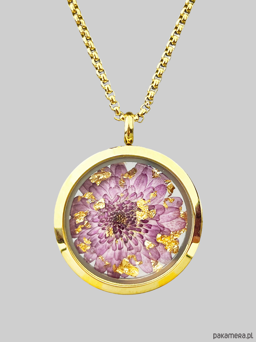 Autorski wisior z prawdziwym kwiatem chryzantemy. Utrwalony specjalnie dobraną techniką, będzie cieszyć swoim pięknem i symboliką długie lata, nie tylko w sezonie.