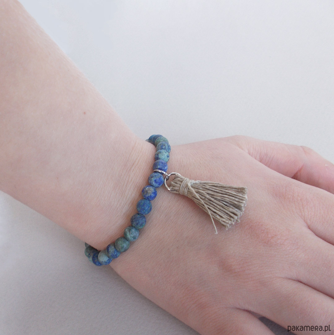 Naturalna bransoletka wykonana z matowych kul chryzokoli i lnianego frędzla