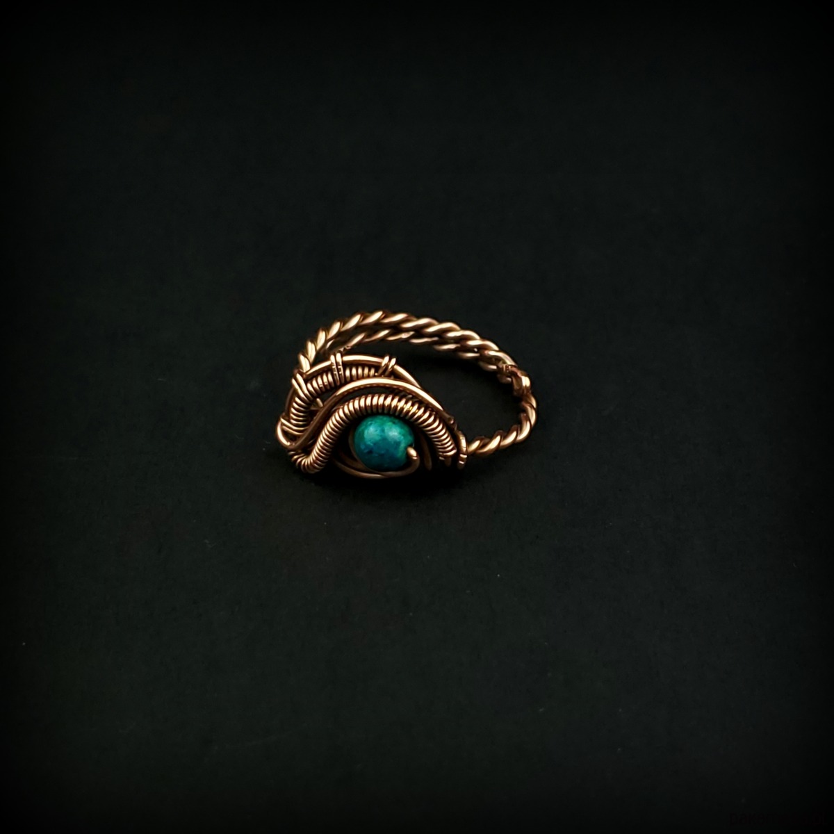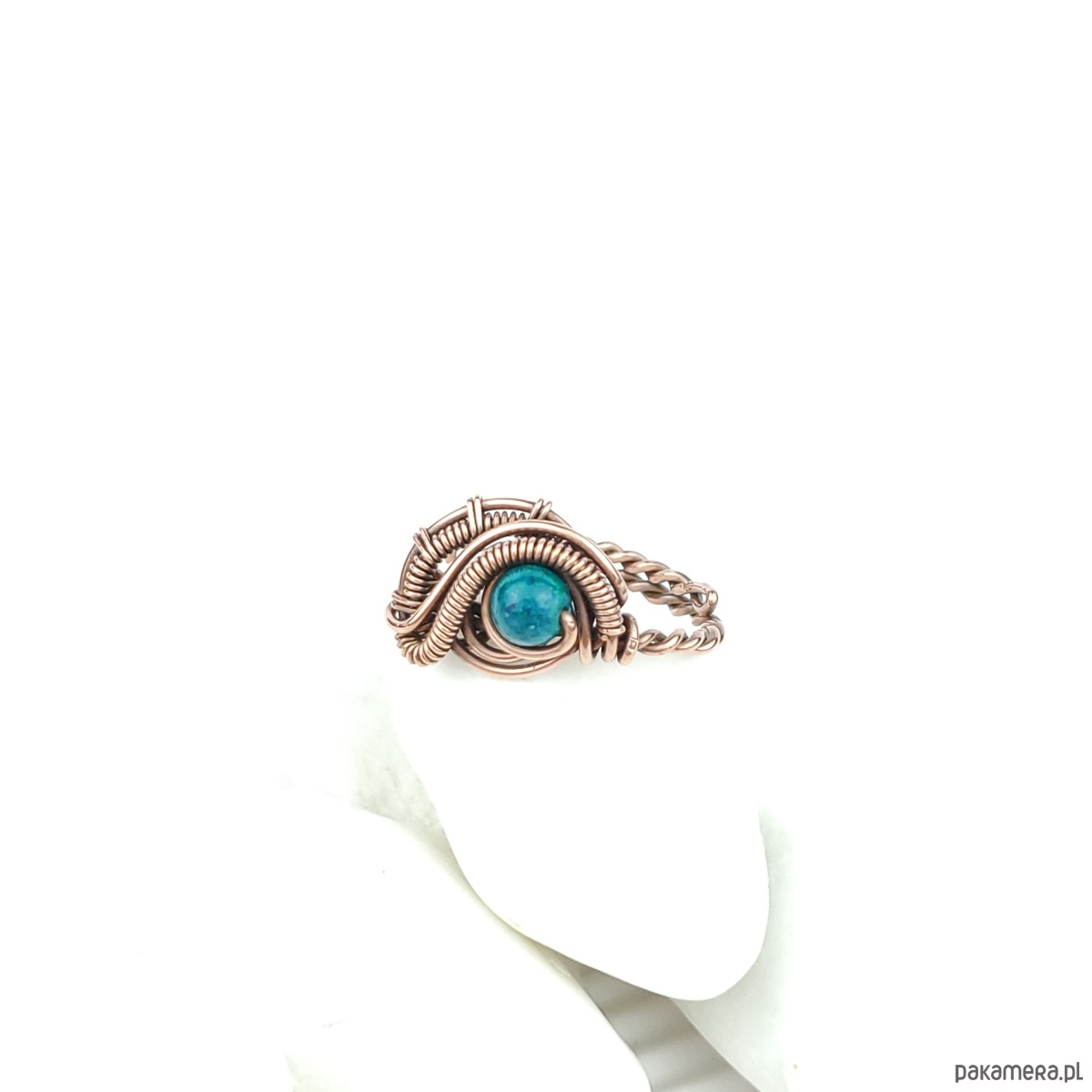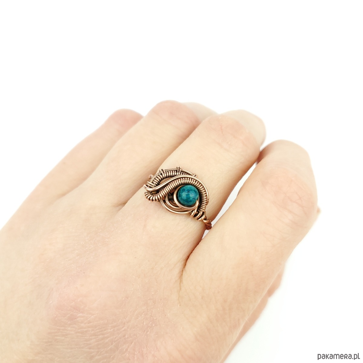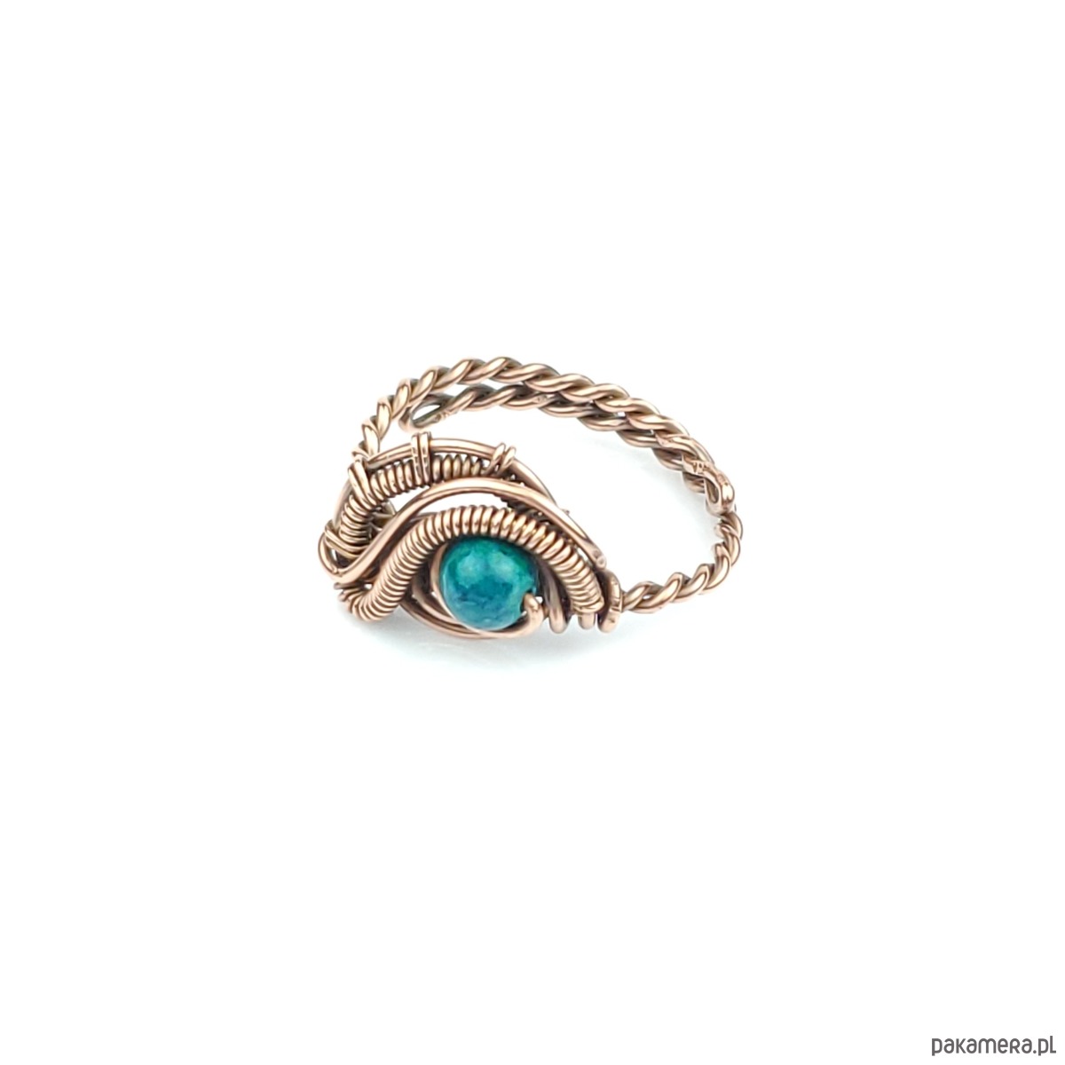 Pierścionek wykonany w pracochłonnej technice wire wrappingu. Centralnym punktem jest tu chryzokola, która została misternie opleciona miedzią. Pierścionek w uniwersalnym rozmiarze, możliwość regulacji.