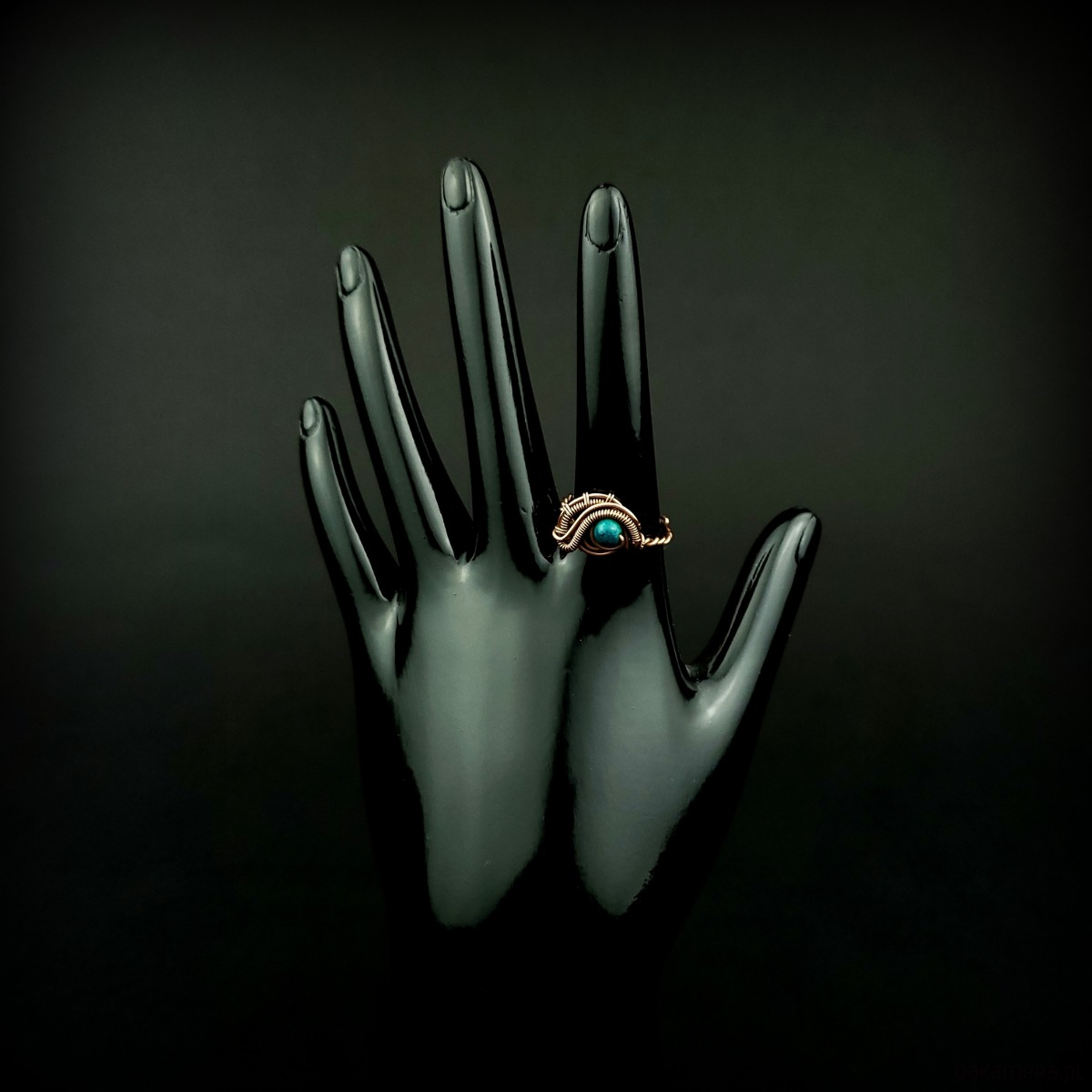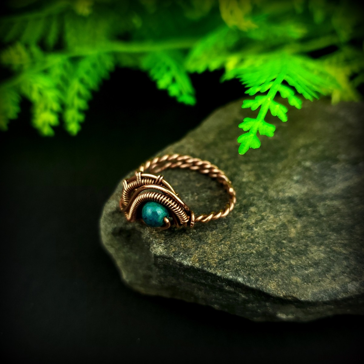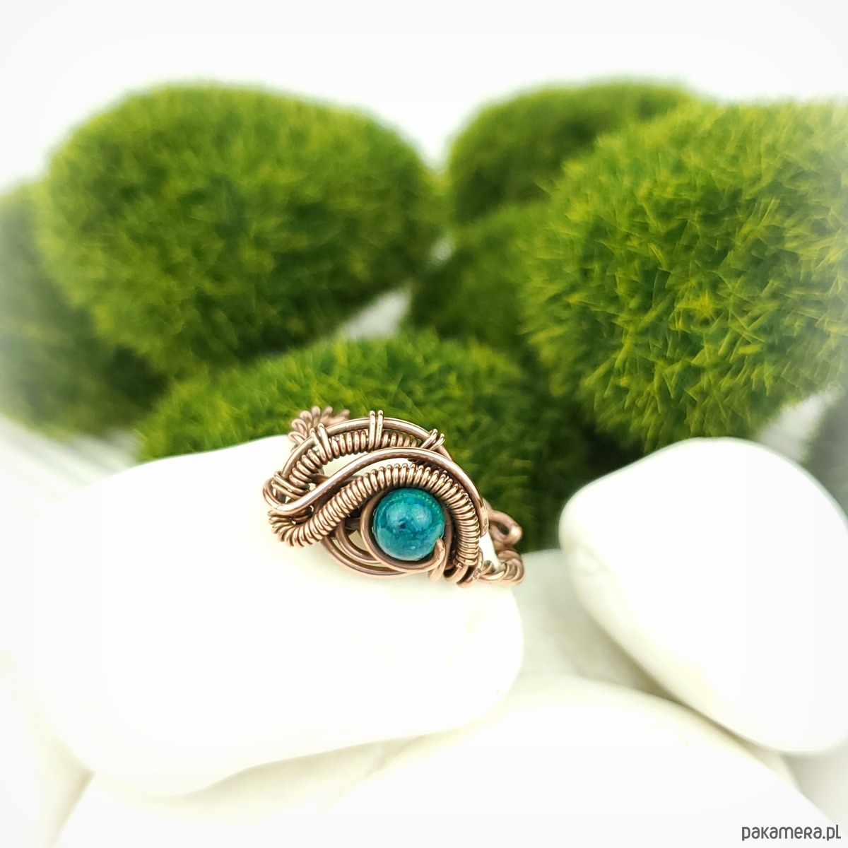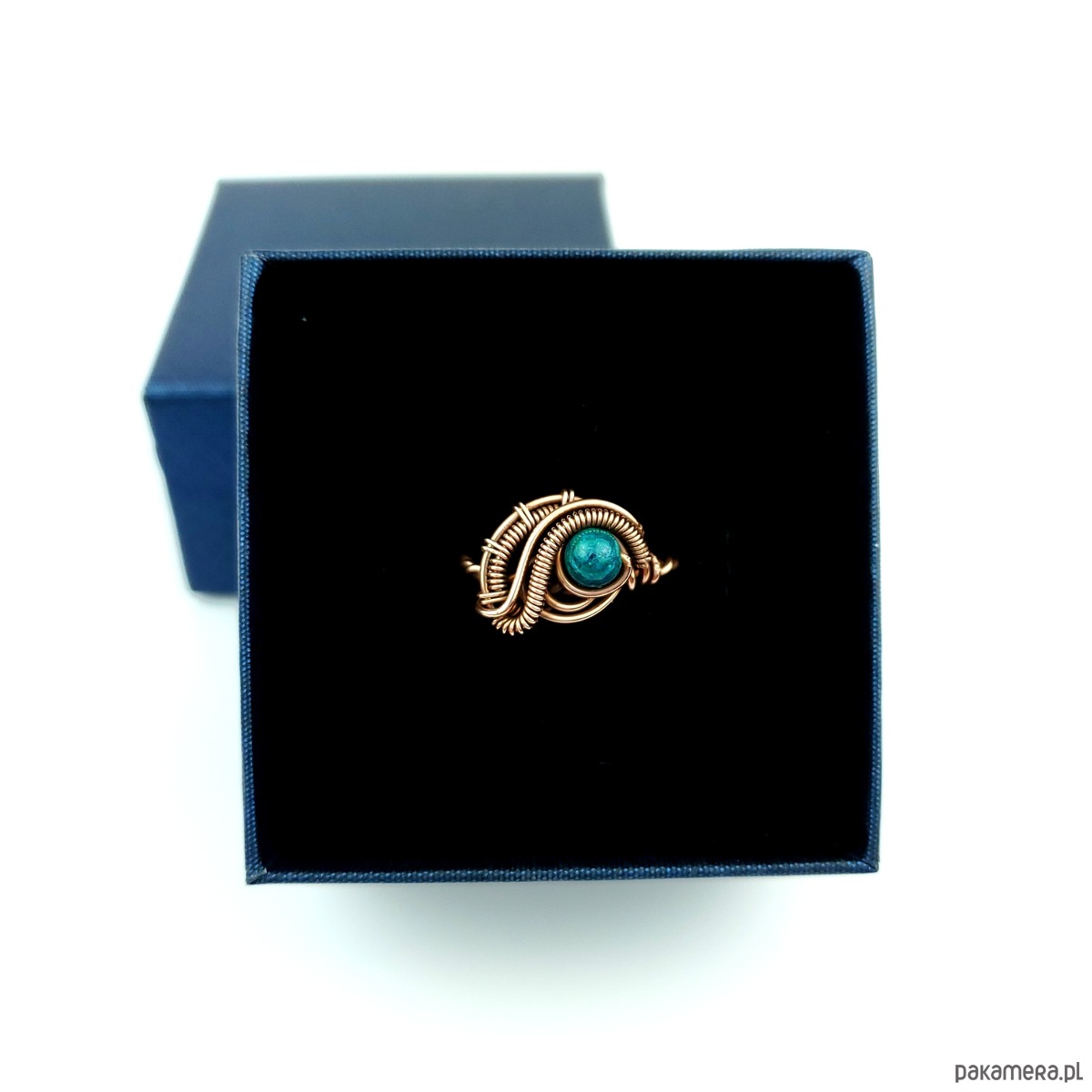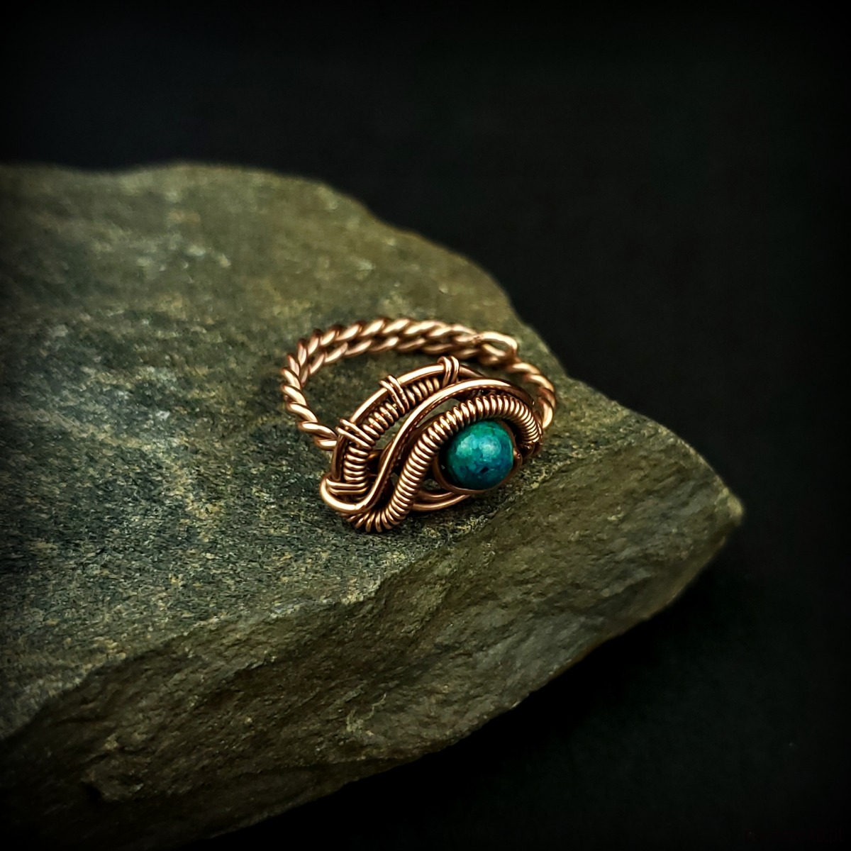 Pierścionek wykonany w pracochłonnej technice wire wrappingu. Centralnym punktem jest tu chryzokola, która została misternie opleciona miedzią. Pierścionek w uniwersalnym rozmiarze, możliwość regulacji.