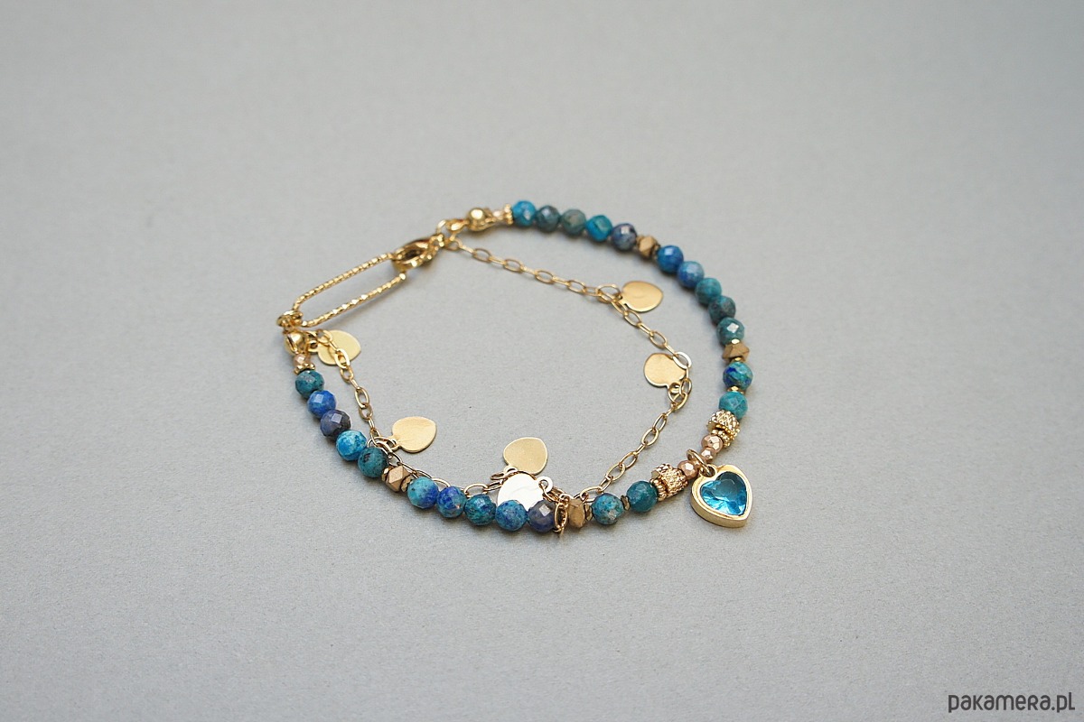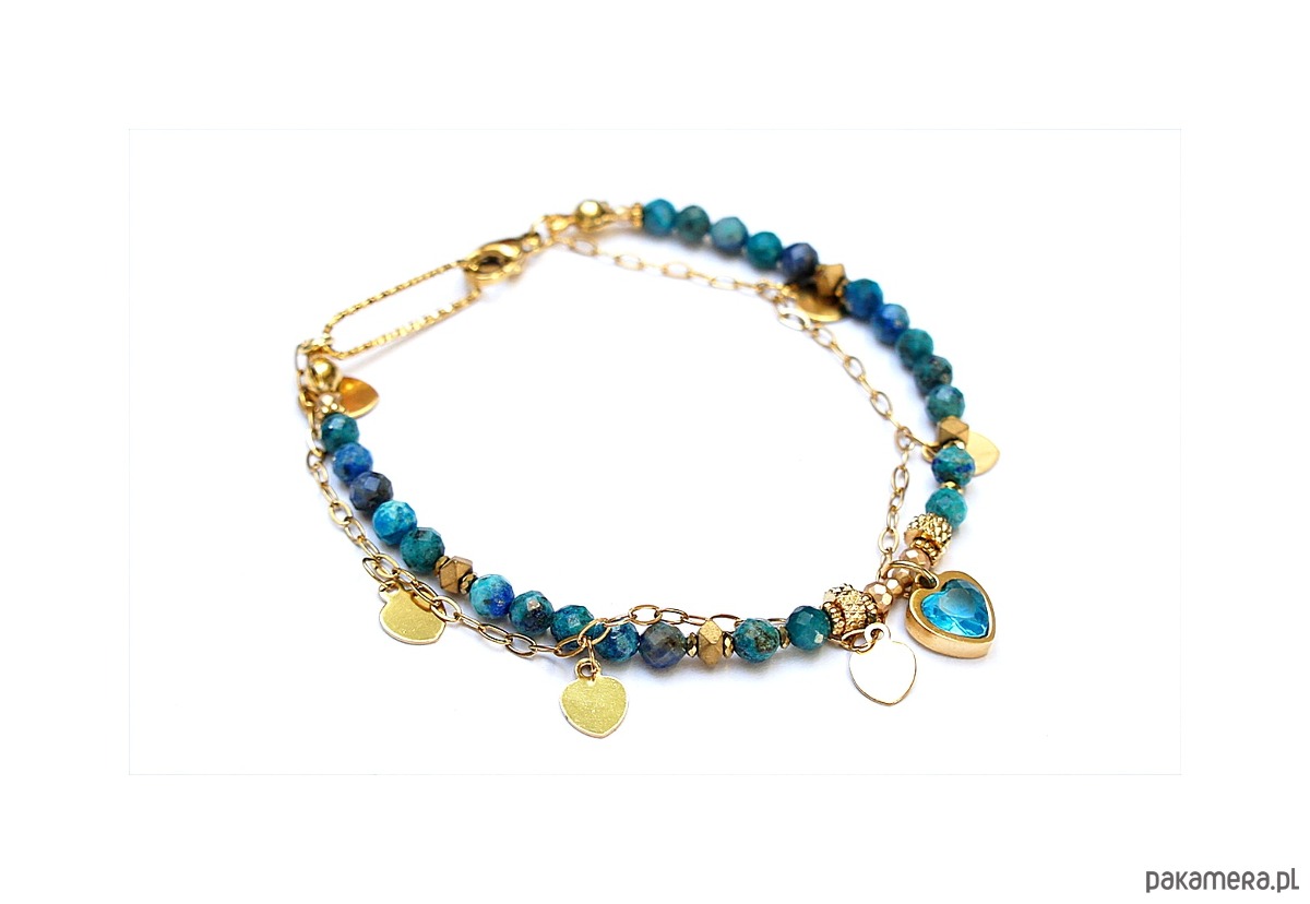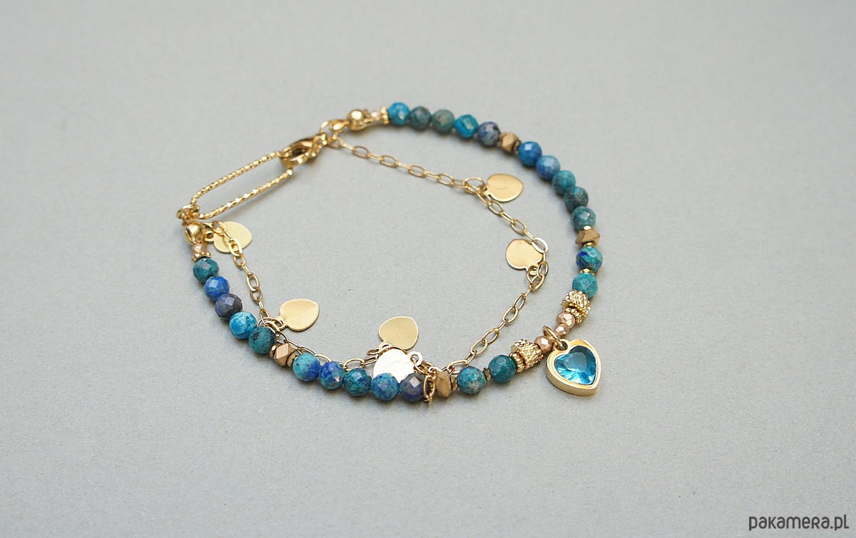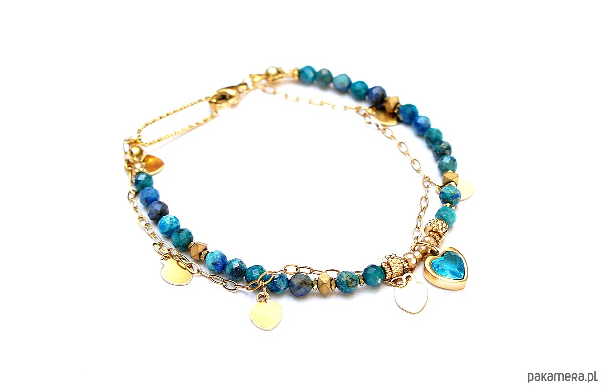 Bransoletka wykonana w całości z pozłacanej stali szlachetnej oraz naturalnych kamieni - fasetowana chryzokola [4mm], hematytu fasetowanego, platerowanego [2mm i 3mm], przekładek z hematytu [3 x 2mm oraz 1mm] oraz zawieszki z cyrkonią w okuciu. Całkowita długość bransoletki 18,5cm (możliwość dopasowania bransoletki do innego nadgarstka).